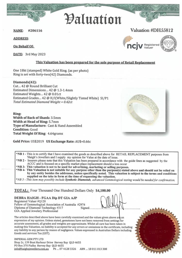 Diamond dress ring with round Natural Diamonds totalling approximately 0.42ct (Estimated grading: H-I SI-P1). 18ct white gold. Ring size M - ring resizing is not recommended. Weight: 4.7g. With Valuation Certificate #DH55812. (Pre-owned)