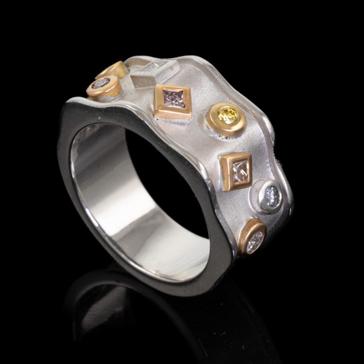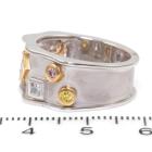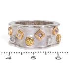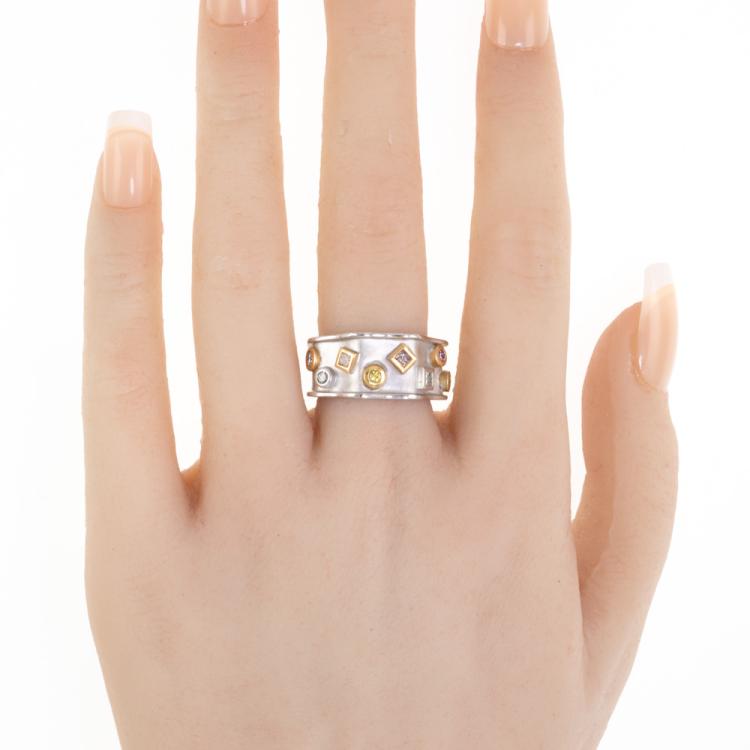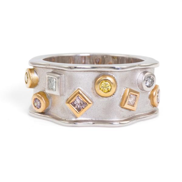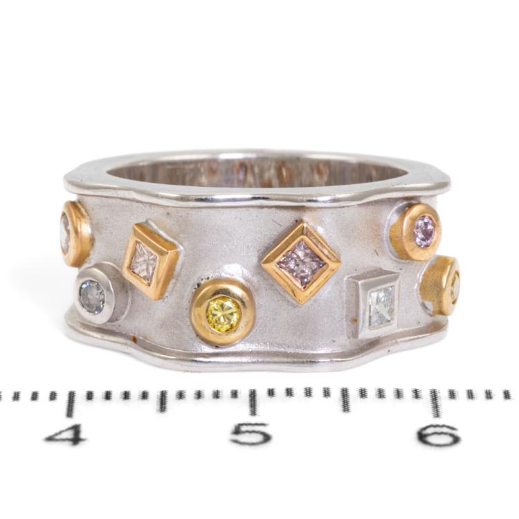 Diamond dress ring with four natural fancy pink Diamonds totalling 0.22ct, two natural yellow Diamonds totalling 0.10ct and two natural blue Diamonds totalling 0.11ct. 18ct rose & white gold. Ring size M1/2. Band width: 7.4mm-9.0mm. Weight: 10.8g. With Valuation Certificate #418874. (As new)
