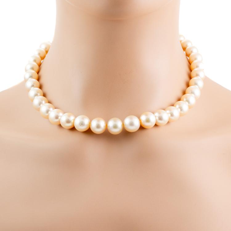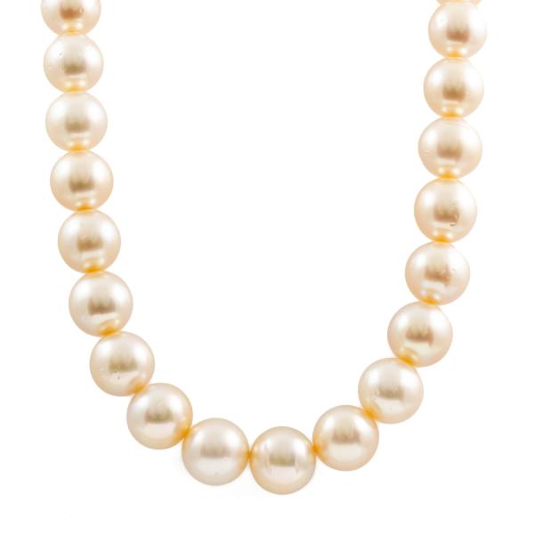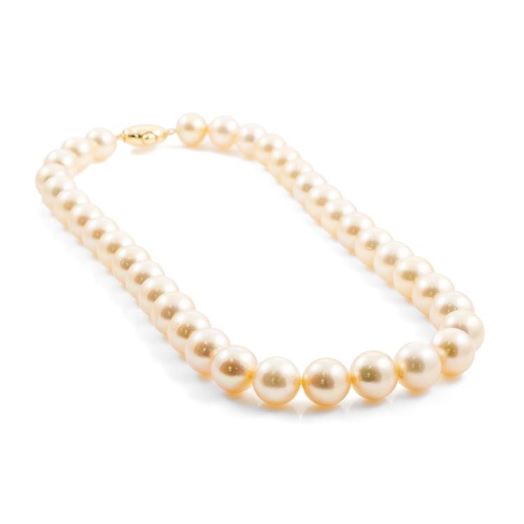 Pearl necklace with 37 slightly graduated Golden South Sea Pearls of 10.1mm - 11.8mm. 18ct yellow gold clasp. Length: 43cm. Weight: 76.1g. With Certificate #418722.