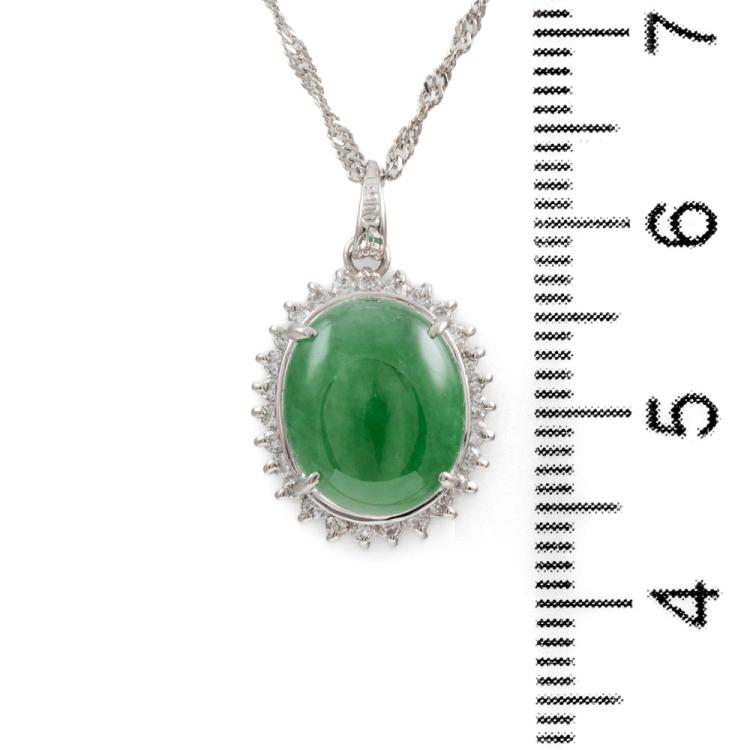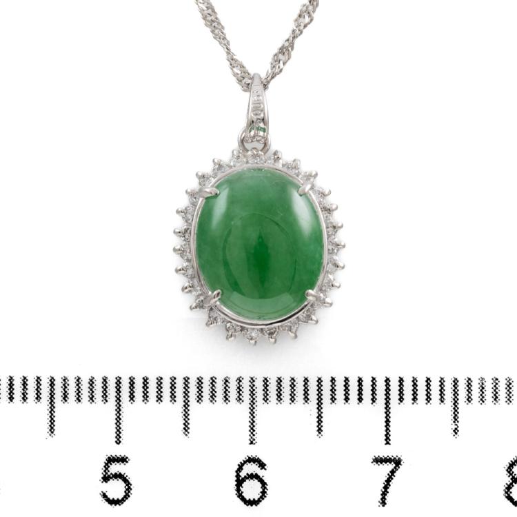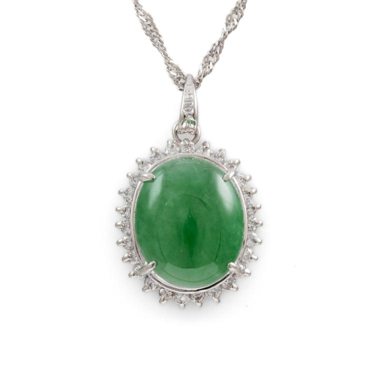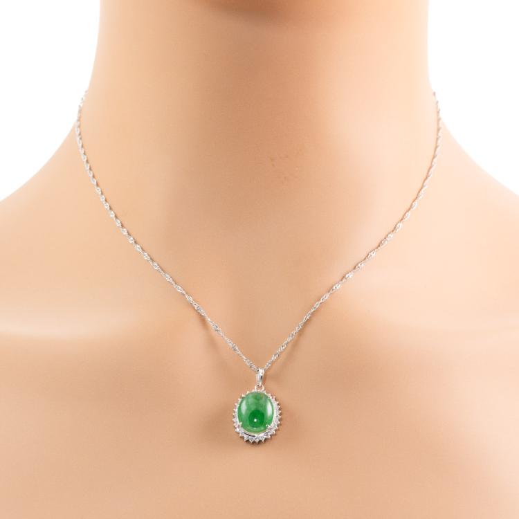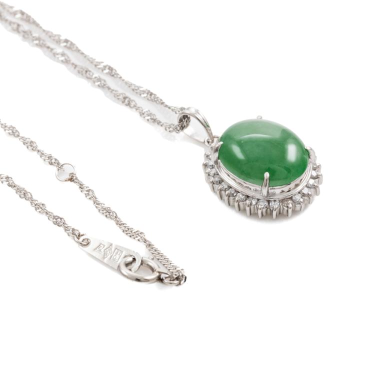 Jade and Diamond Dress Pendant with oval cabochon cut Natural Jadeite Jade - Type A of 3.65ct and round Natural Diamonds totalling 0.24ct (Estimated grading: H-I SI-I1). Pendant length 14.8mm. Platinum 900 with platinum 850 adjustable chain 37cm - 40cm. Weight: 4.9g. (Pre-owned)