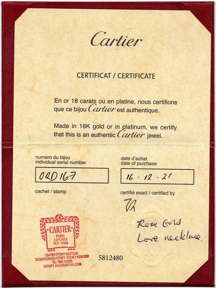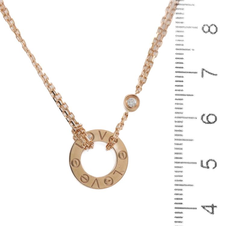 Cartier Love necklace with 2 round Diamonds totalling 0.03cts. 18ct rose gold with Cartier 18ct rose gold attached chain. Adjustable max length: 38.0cm - 41.0cm. Weight: 6.1g. With Cartier Authenticity Certificate dated 16/12/21 and Cartier pouch and copy of purchase receipt dated 16/12/21. (Pre-owned)