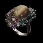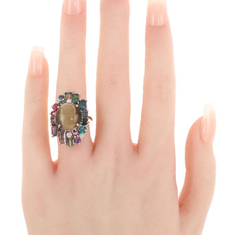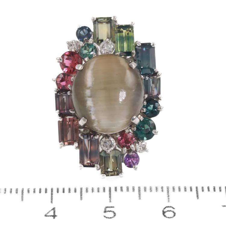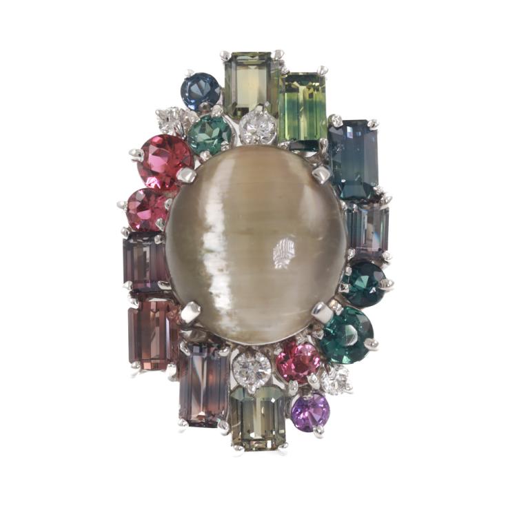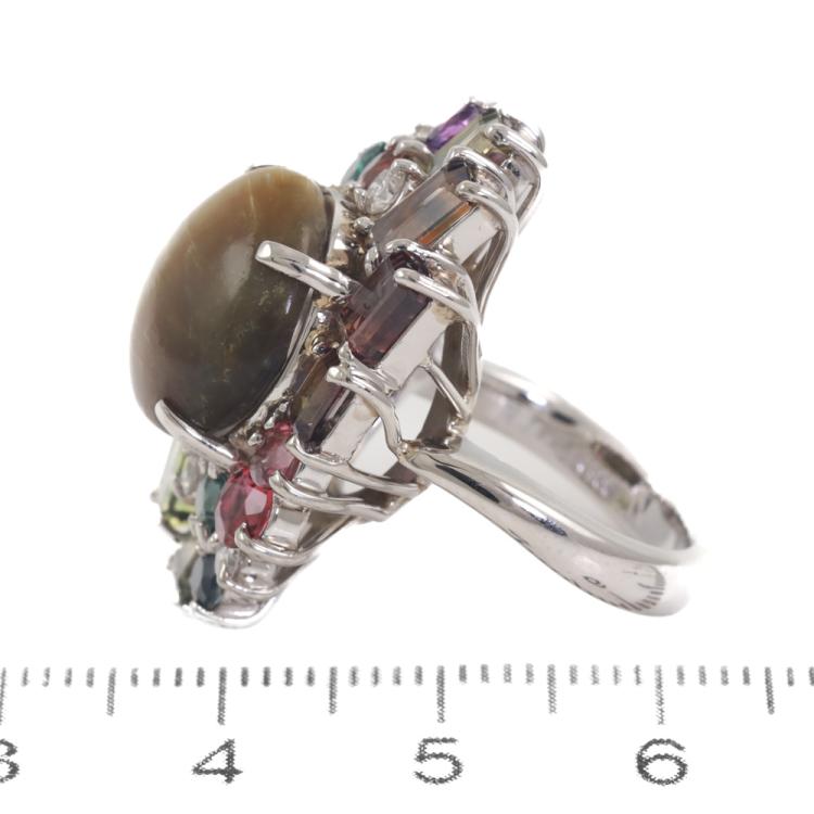 Catseye, multicolour Tourmaline and Diamond ring with centre cabochon cut greyish brown Natural Chrysoberyl Catseye of 6.26ct, round & baguette cut Multicolours Natural Tourmalines totalling approximately 3.00ct and round Natural Diamonds totalling 0.17ct. Platinum - 900. Ring size: H. Band width: 3.1mm - 3.2mm. Weight: 16.3g. (Pre-owned)