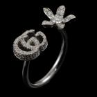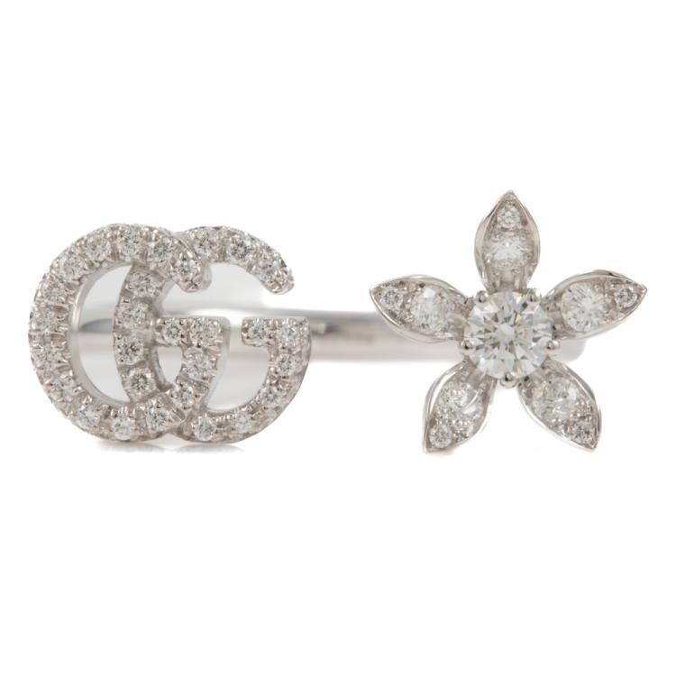 Gucci Flora GG open ring with round Natural Diamonds totalling 0.55ct (Estimated grading: F-G VS). 18ct white gold. Gucci stamped size 14, actual size L1/2 - ring resizing is not recommended. Band width: 2.2mm. Made in Italy. Weight: 4.7g. With Gucci box. With Certificate #419206. (Pre-owned)