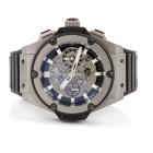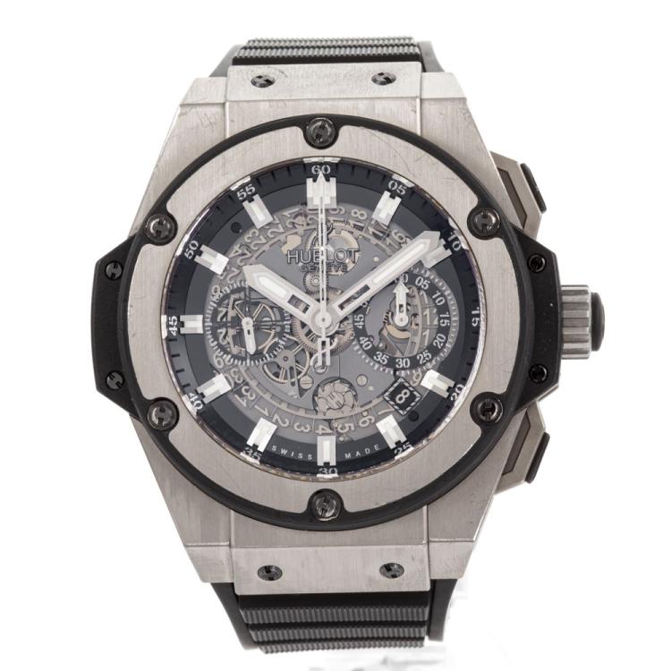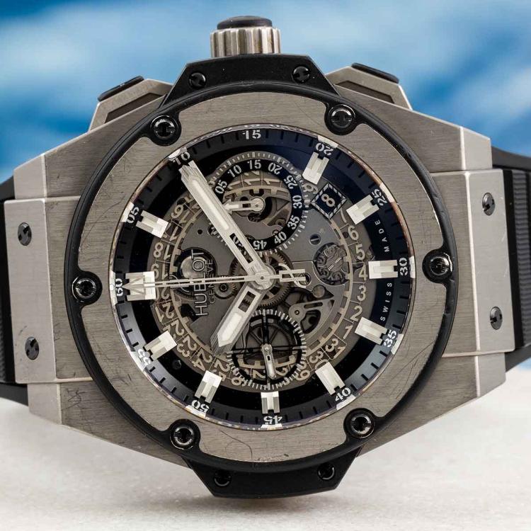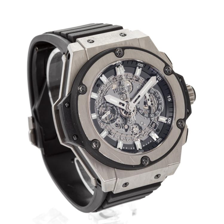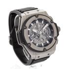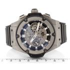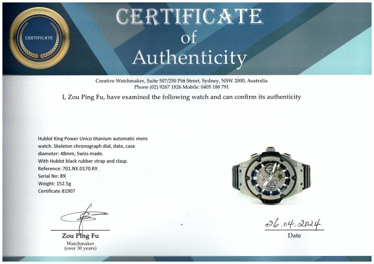 Hublot King Power Unico titanium automatic mens watch. Skeleton chronograph dial, date, case diameter: 48mm, adjustable max wrist size: 19.5cm, Swiss made. Ref# 701.NX.0170.RX. With Hublot black rubber strap and clasp. With Certificate of Authenticity. 3 month FSA warranty (Pre-owned)