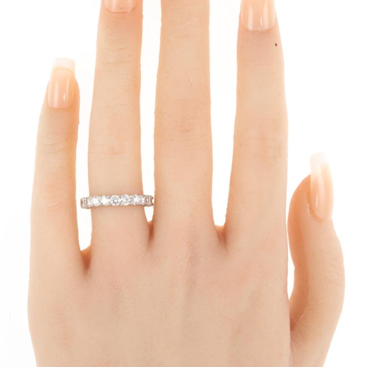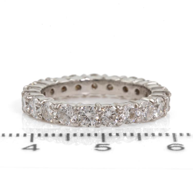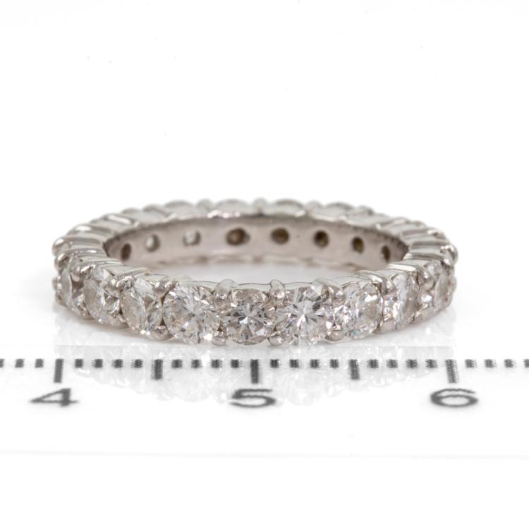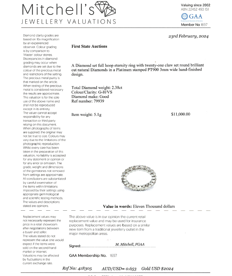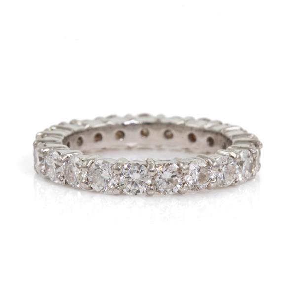 Diamond full hoop eternity ring with round Natural Diamonds totalling 2.38cts (Estimated grading: G-H VS). Platinum 900. Ring size K1/2 - ring resizing is not recommended. Band width: 3mm. Weight: 5.1g. With Certificate #418305. (Pre-owned)