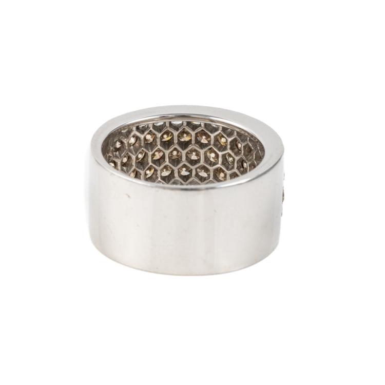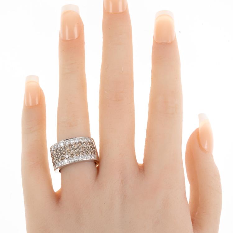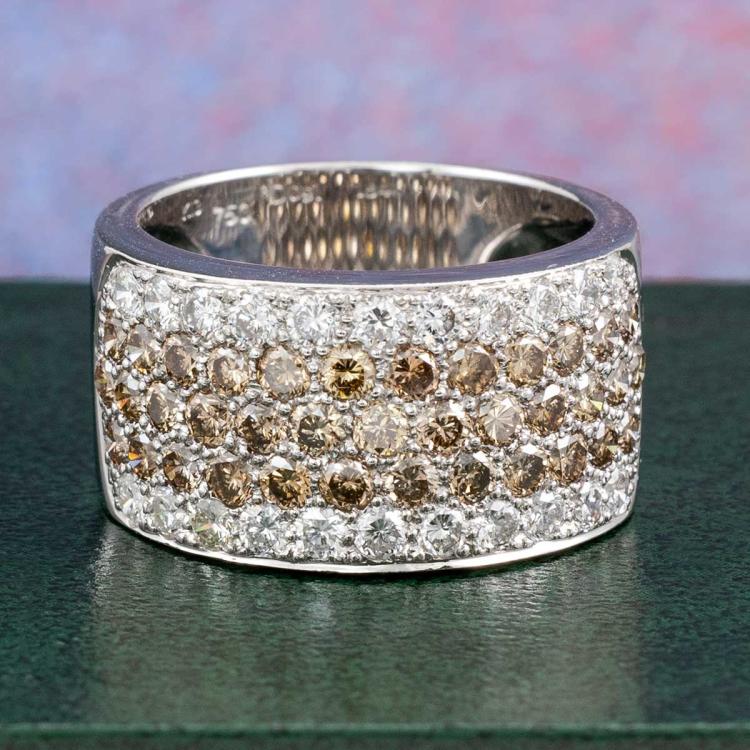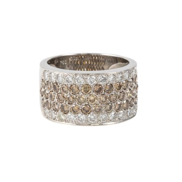 Diamond 5 row ring with 3 row round Natural Champagne Diamonds totalling 1.84cts (Estimated grading: Champagne VS-SI) and round Natural white Diamonds totalling 0.91cts (Estimated grading: H VS-SI). 18ct white gold. Ring size O - ring resizing is not recommended. Band width: 10.6mm-11.3mm. Weight: 11.1g. (Pre-owned)