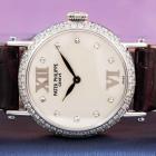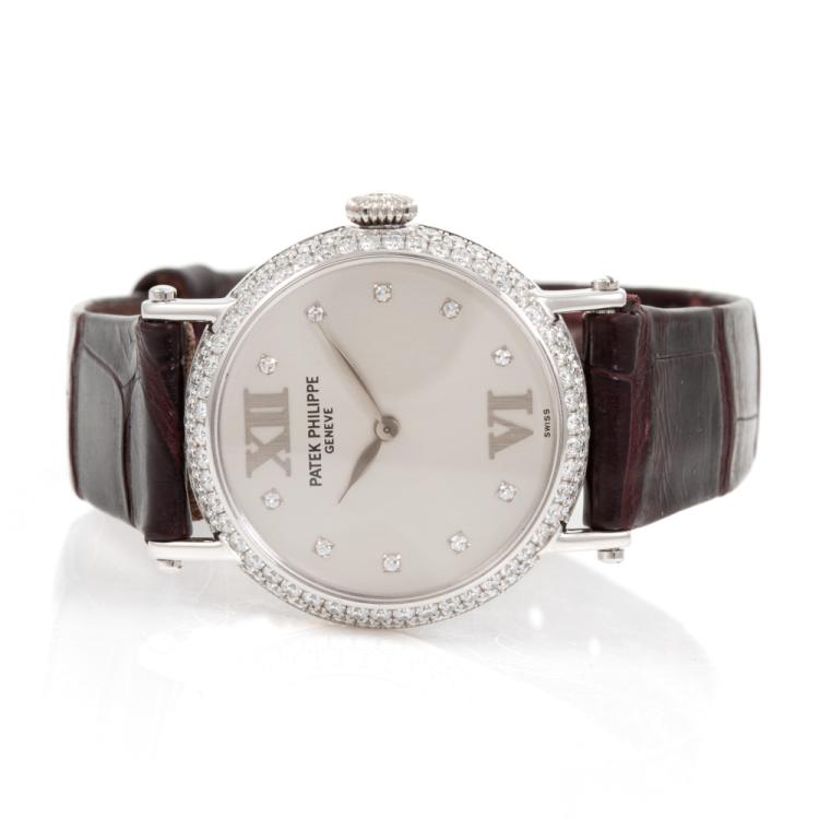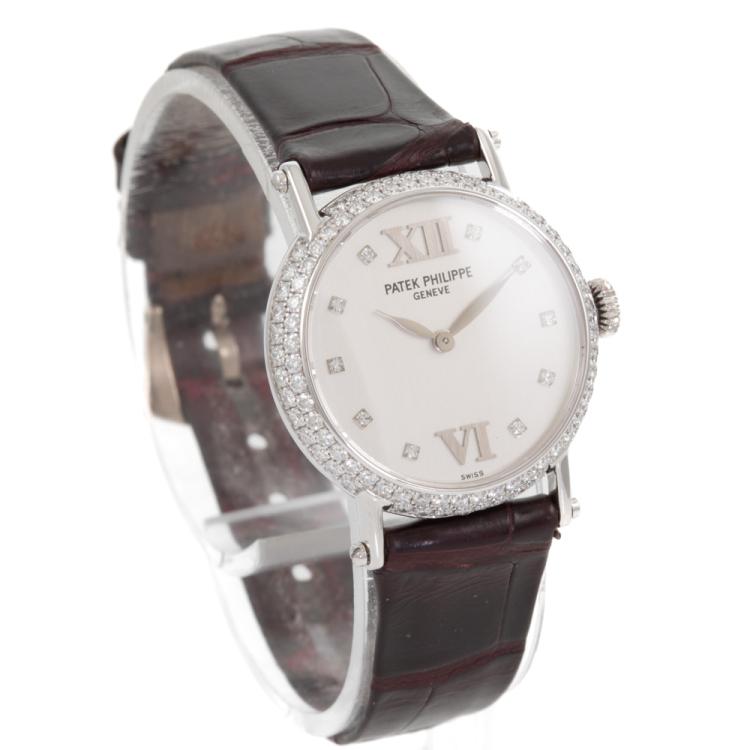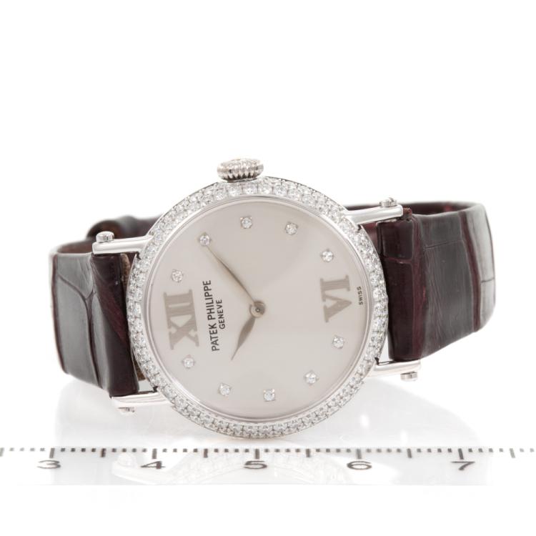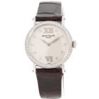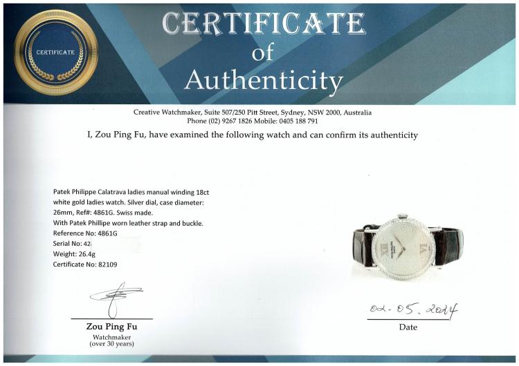 Patek Philippe Calatrava ladies manual winding 18ct white gold ladies watch. Silver dial, case diameter: 26mm, wrist size: 17.5cm, Ref#4861G. Swiss made. With Patek Phillipe worn leather strap and buckle. With Certificate of Authenticity. With 3 month Warranty. (Pre- Owned)
