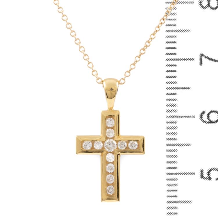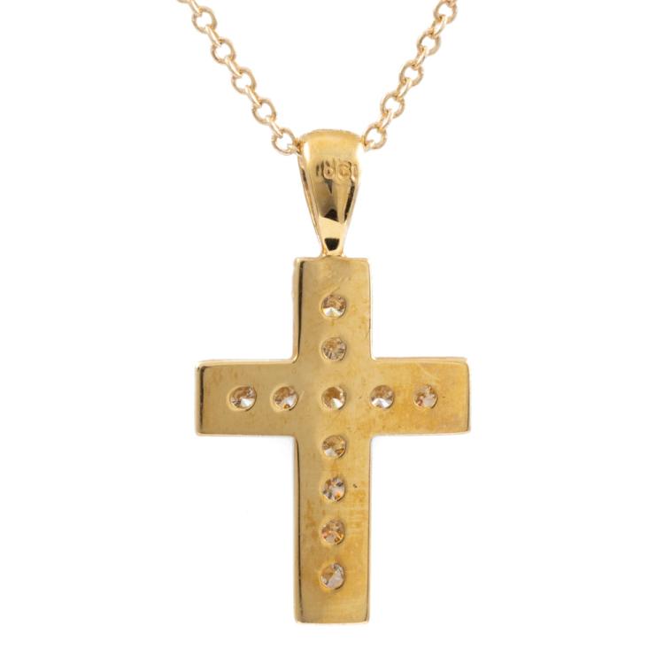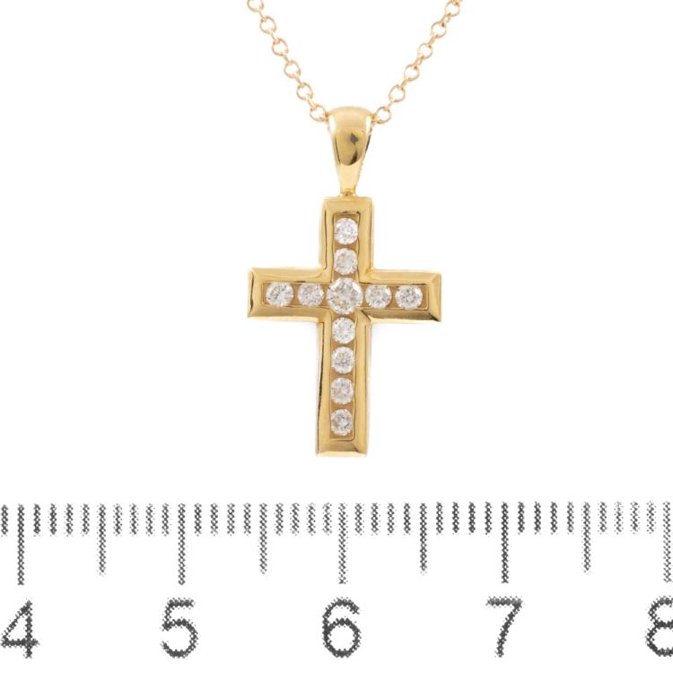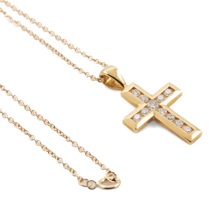Diamond cross pendant with round Natural Diamonds totalling 0.25ct. (Estimated grading: H-I SI) 18ct yellow gold with 40cm 14ct yellow gold chain. Weight: 2.7g. (As New)