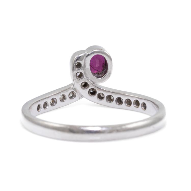 Ruby and Diamond ring with an oval Natural Ruby of approximately 0.25ct and round Natural Diamonds totalling approximately 0.15ct. 18ct white gold. Ring size R1/2. Band width: 2.3mm-2.5mm. Weight: 4g. (Pre-owned)
