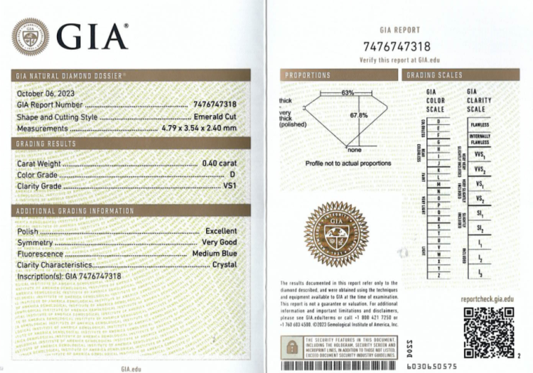 A loose emerald cut Natural Diamond of 0.40ct (with GIA Summary Report graded as D VS1 # 7476747318). (New)