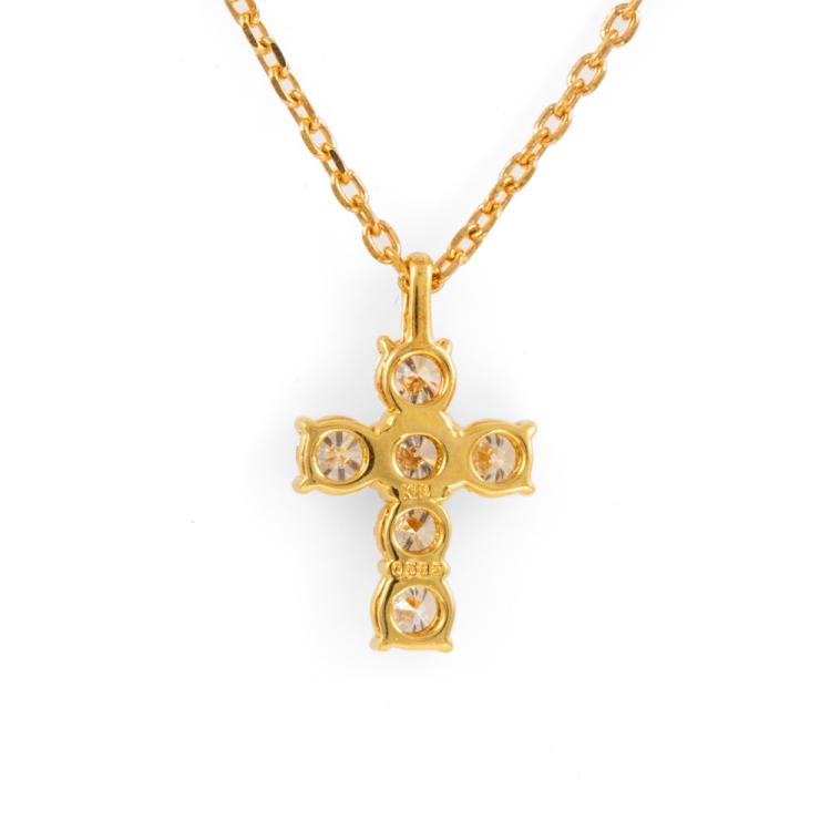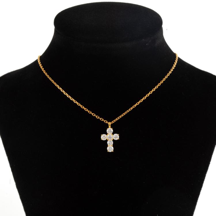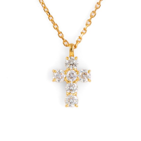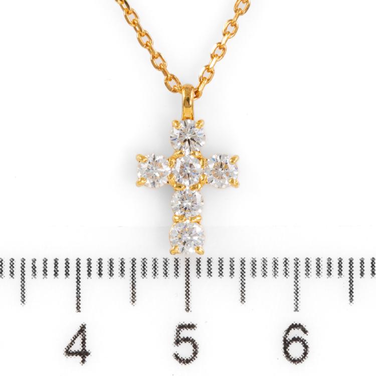 Diamond cross pendant with 6 round natural Diamonds totalling 0.68ct (Estimated grading: G-H SI). 18ct yellow gold with 18ct yellow 50cm maximum adjustable chain. Weight: 4.1g. (Pre-owned)