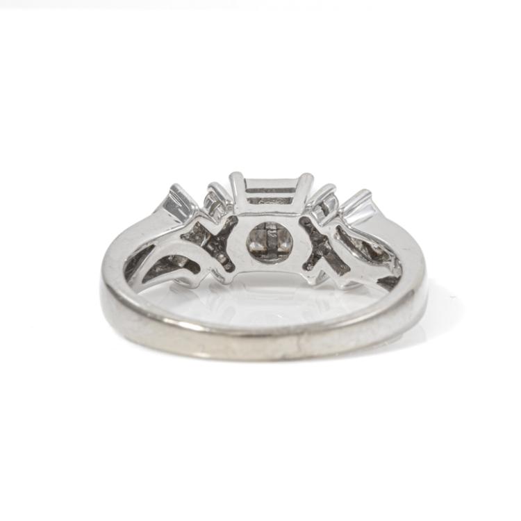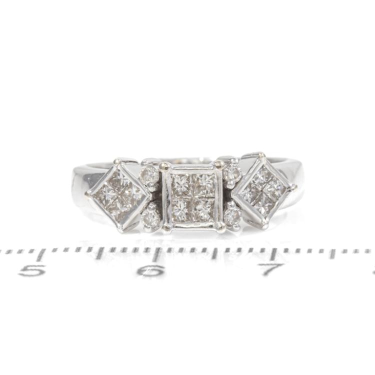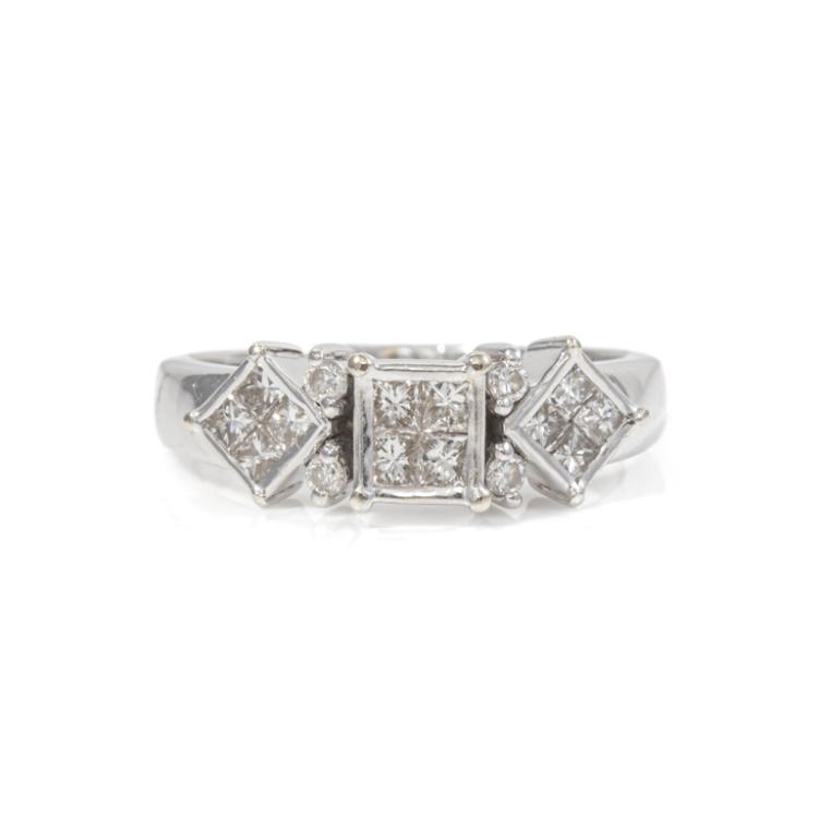 Diamond dress ring with round & princess cut invisible set natural Diamonds totalling 0.82ct (Estimated grading: I-J SI). 18ct white gold. Ring size O - ring resizing is not recommended. Band width: 2.3mm-4.1mm. Weight: 5.2g. (Pre-owned)