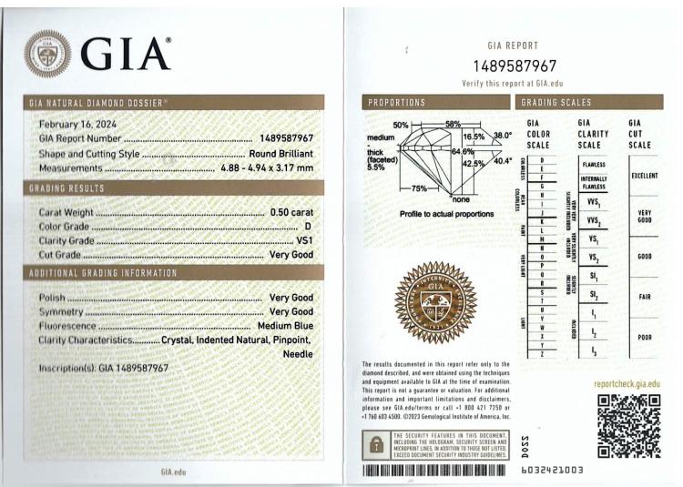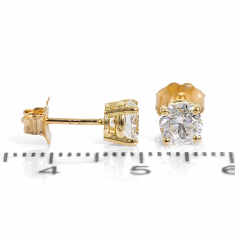 Diamond stud earrings with 2 round brilliant cut natural Diamonds totalling 1.00cts (both with GIA Summary Reports both graded as D VS1 #1489587967, 6485573047). 18ct yellow gold. Weight 1.1g (New)