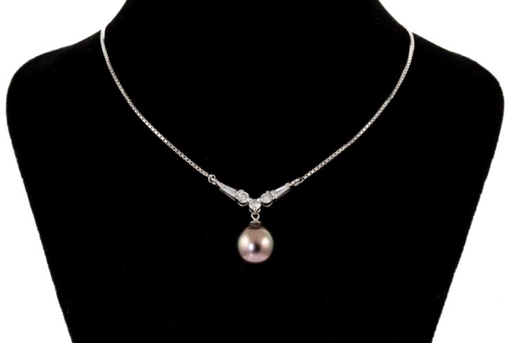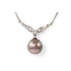 Tahitian Pearl and Diamond necklace with Tahitian Pearl of 10.0mm and baguette cut and round Natural Diamonds totalling 0.45ct (Estimated grading: H SI). Platinum 900 with platinum 850 attached chain. Length: Maximum 42cm. Weight: 6.7g. (Pre-owned)