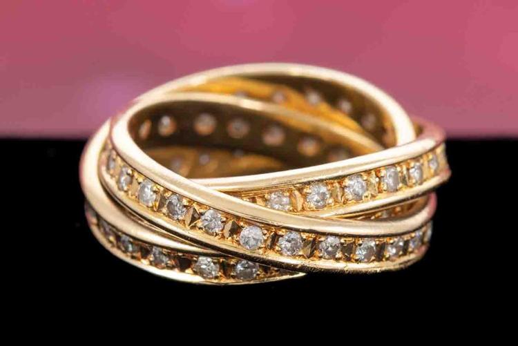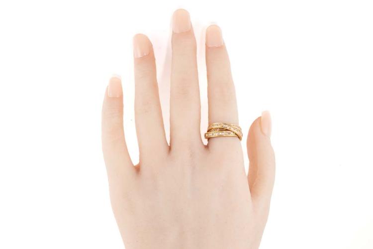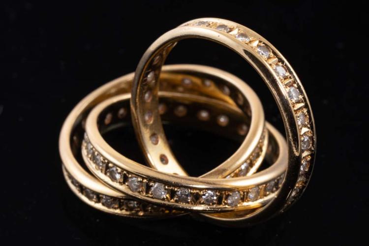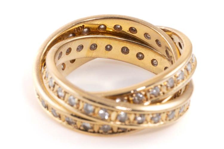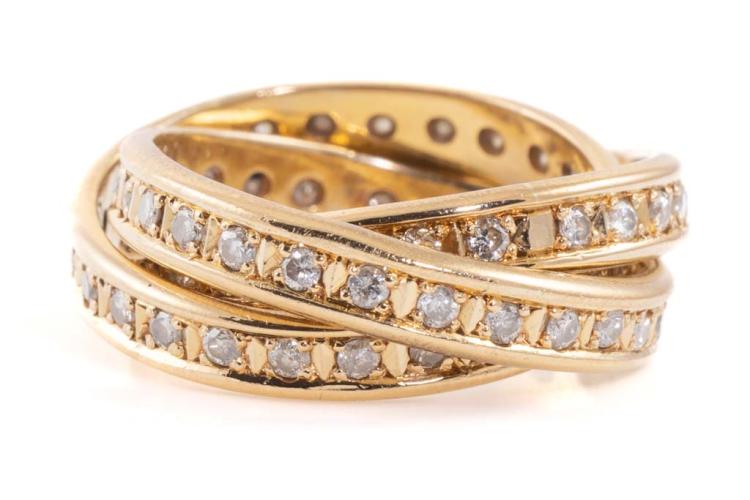 Diamond Russian wedding ring with 3 interlocking bands set with Natural Diamonds totalling 1.02cts (Estimated grading: I-J P1-2). 18ct yellow gold. Ring size J. Weight: 8.6g. (Pre-owned)