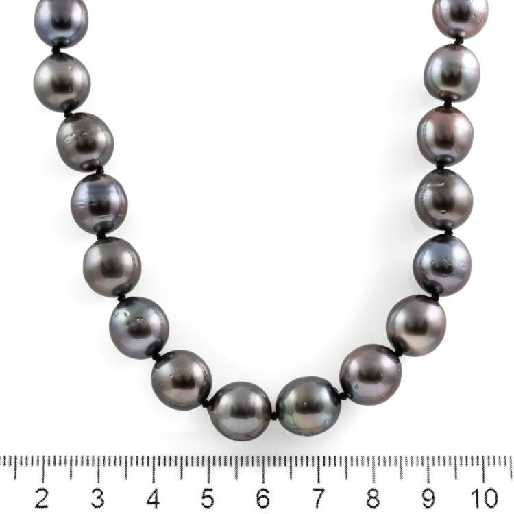 Pearl necklace with 37 slightly graduated Tahitian Pearl of 10.9mm - 9.3mm. 14ct white gold 10mm ball clasp. Length: 46cm. Weight: 63.7g. (Pre-owned)