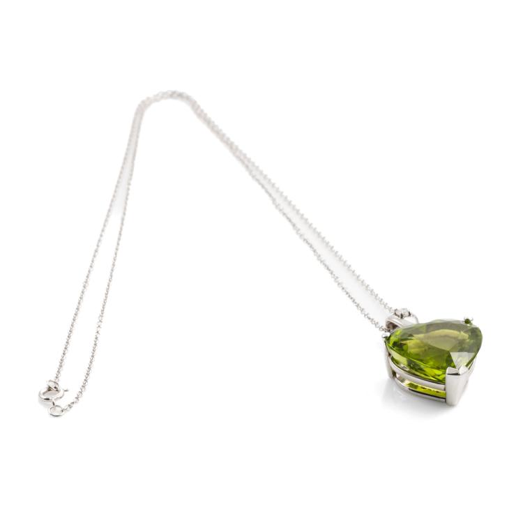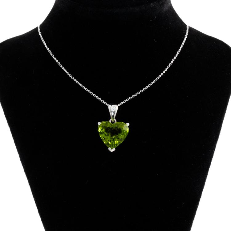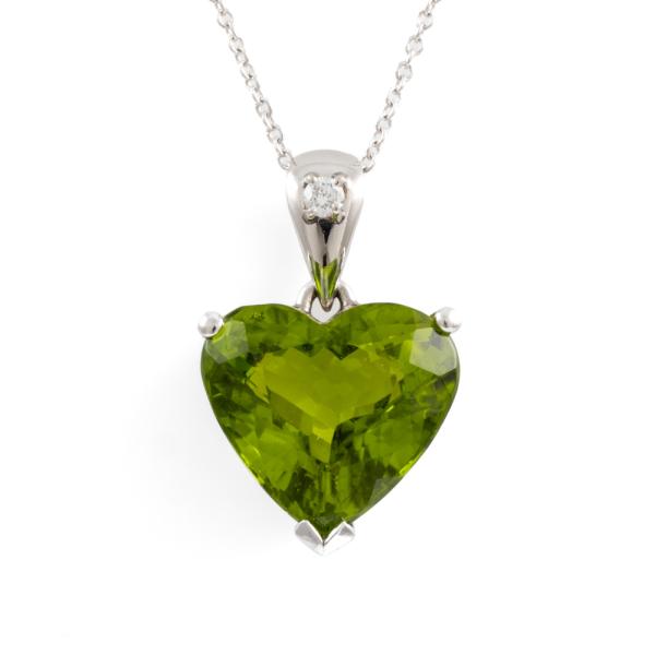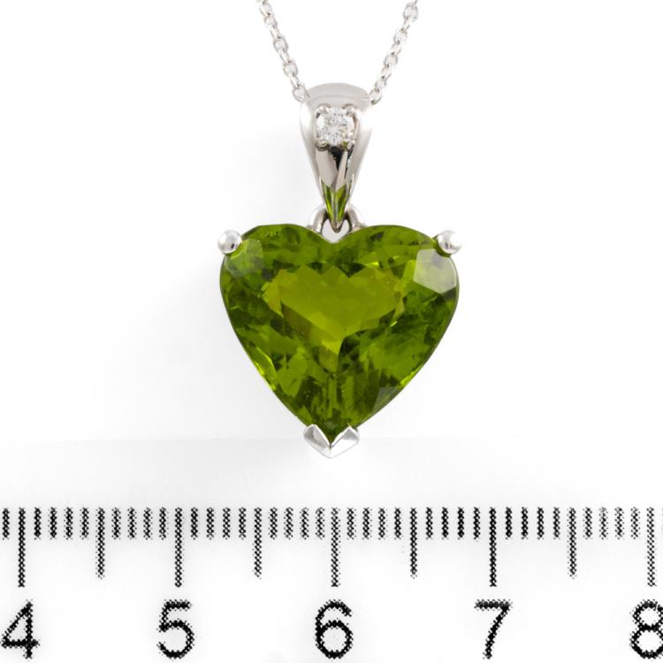 Peridot and Diamond pendant with heart shape Natural Peridot of 11.05ct and round Natural Diamonds of 0.05ct. Platinum - 900 with 14ct white gold 40cm chain. Weight: 7.1g. (Pre-owned)