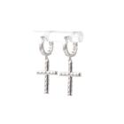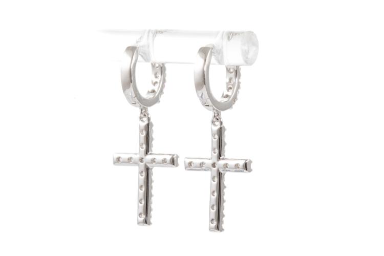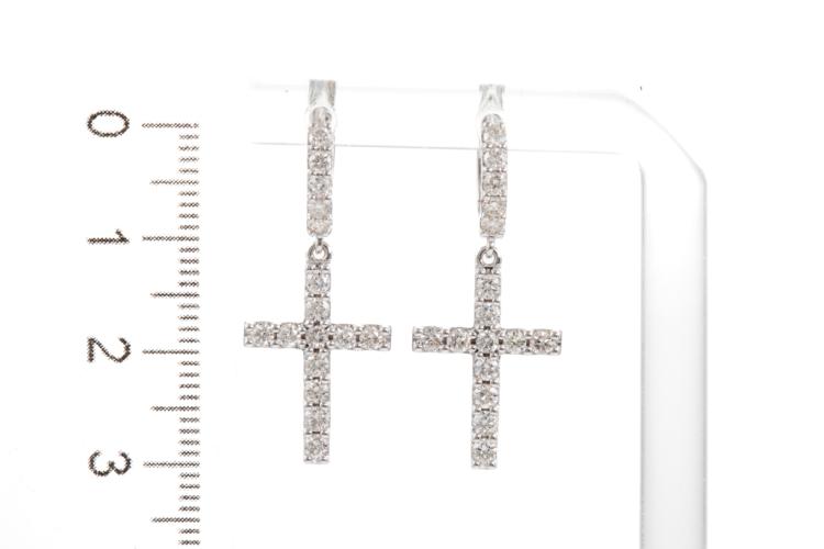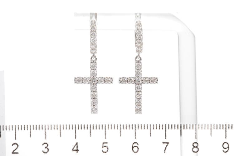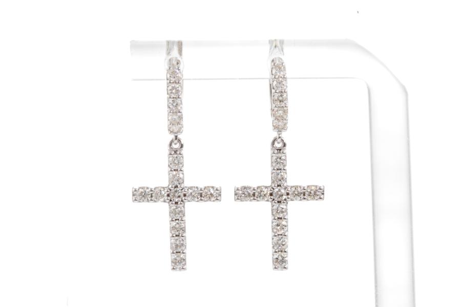 Diamond hoop Cross earrings with 32 round Natural Diamonds totalling 1.14ct (Estimated grading: H SI). 14ct white gold. Item length: 32mm. Weight: 4.3g. (New).