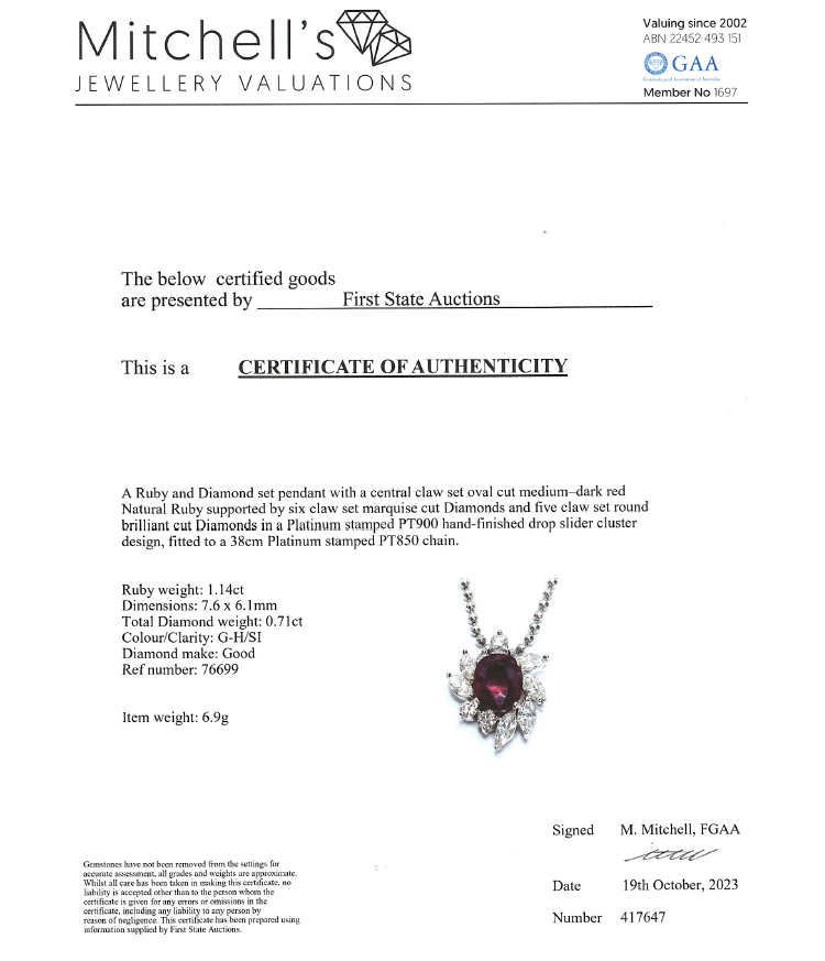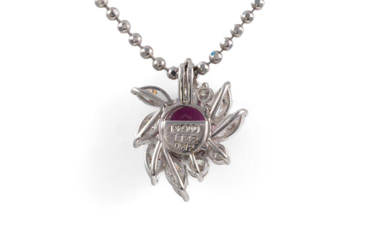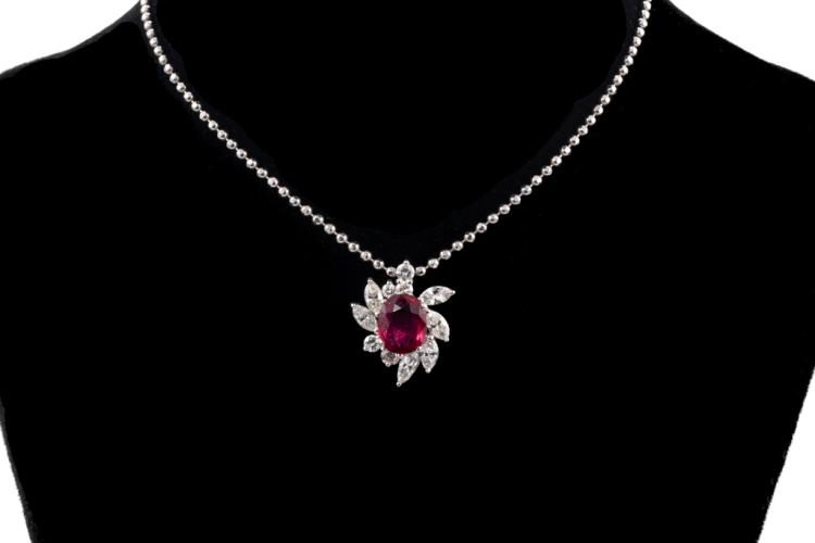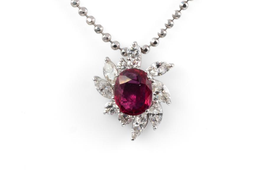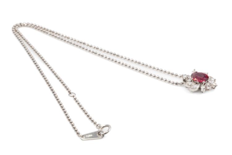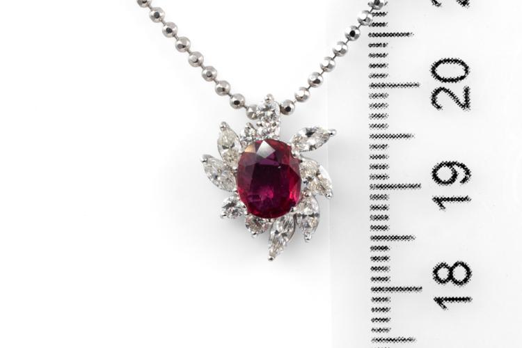 Ruby and Diamond pendant with an oval shape Natural Ruby of 1.14ct and round & marquise cut Natural Diamonds totalling 0.71ct (Estimated grading: G-H SI). Platinum 900 with 38cm Platinum 850 chain. Weight: 6.9g. With Certificate 417647. (Pre-owned)
