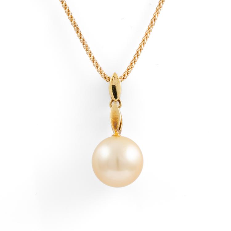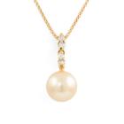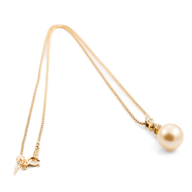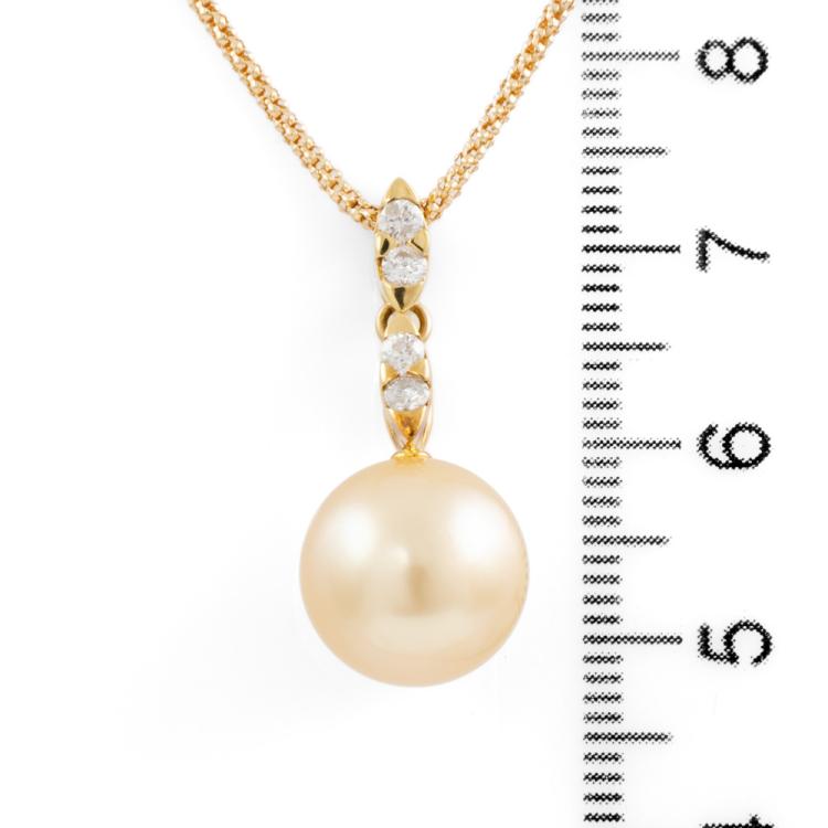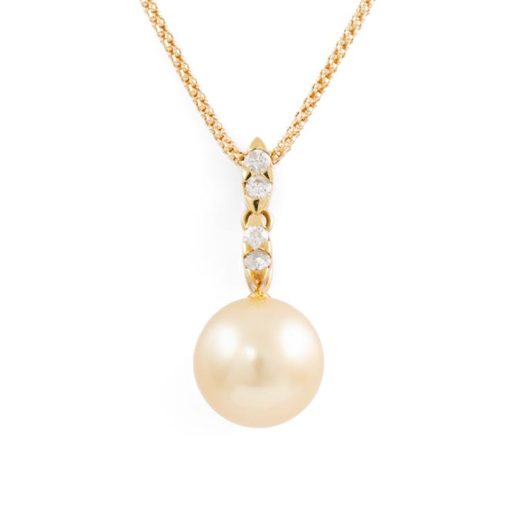 Pearl and Diamond pendant with Golden South Sea Pearl of 11.4mm and round natural Diamonds totalling 0.20ct. 18ct yellow gold with 18ct yellow gold adjustable 44.0cm chain. Weight: 6.2g. (Pre-owned)