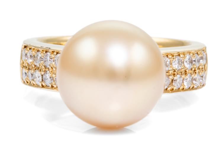 Pearl and Diamond ring with a Golden South Sea Pearl of 11.8mm and round Natural Diamonds totalling 0.40ct (Estimated grading: H SI). 18ct yellow gold. Ring size M. Weight: 11.1g. (Pre-owned)