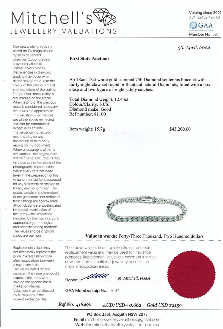 Diamond tennis bracelet with 38 round brilliant cut natural Diamonds totalling 12.43ct (Estimated grading: I-J SI). 18ct white gold. Length: 18cm. Weight: 15.7g. With Valuation Certificate #418496. (New)
