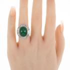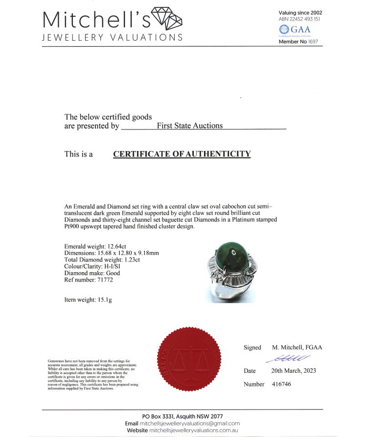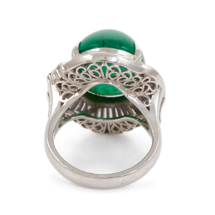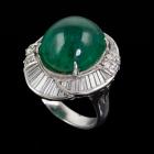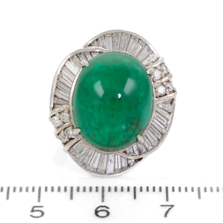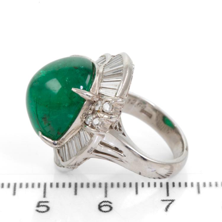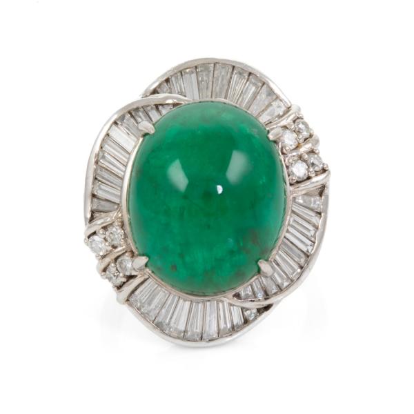 Emerald and Diamond ring with oval cabochon cut natural Emerald of 12.64ct and round & baguette cut natural Diamonds totalling 1.23ct (Estimated grading: H-I SI). Platinum - 900. Ring size G. Weight: 15.1g. With certificate #416746. (Pre-owned)
