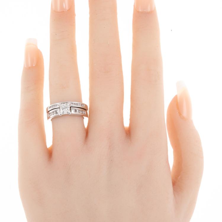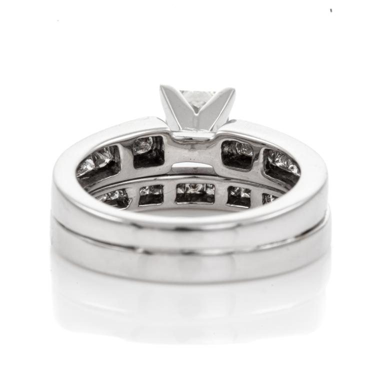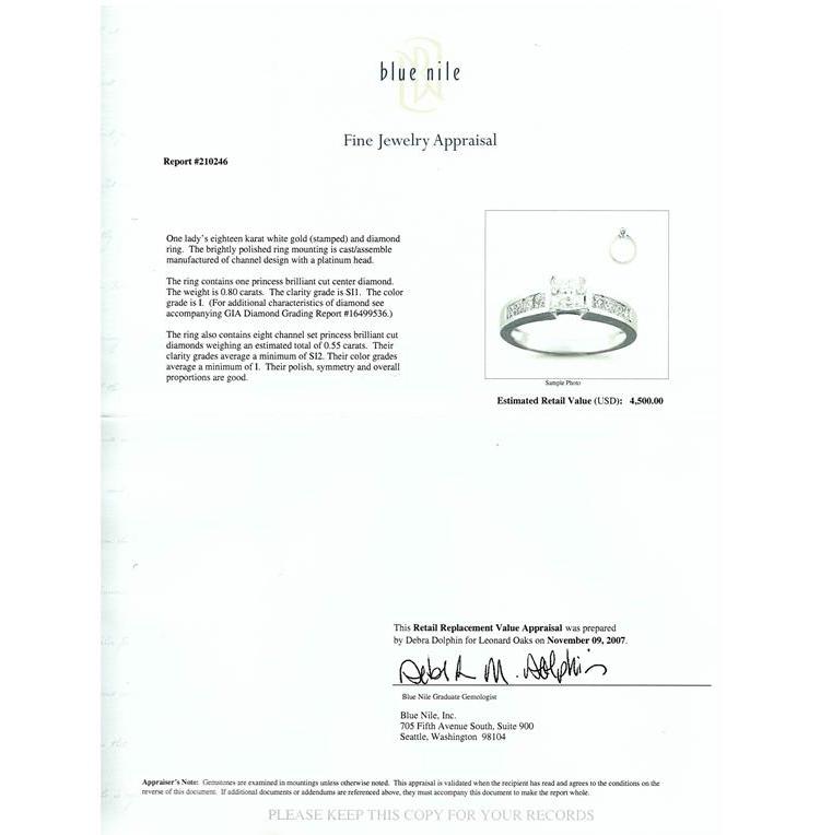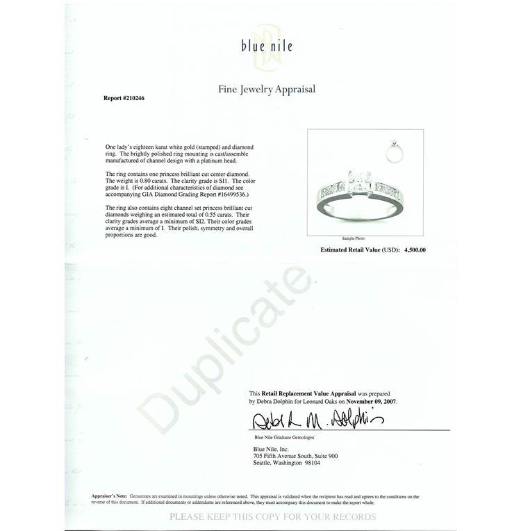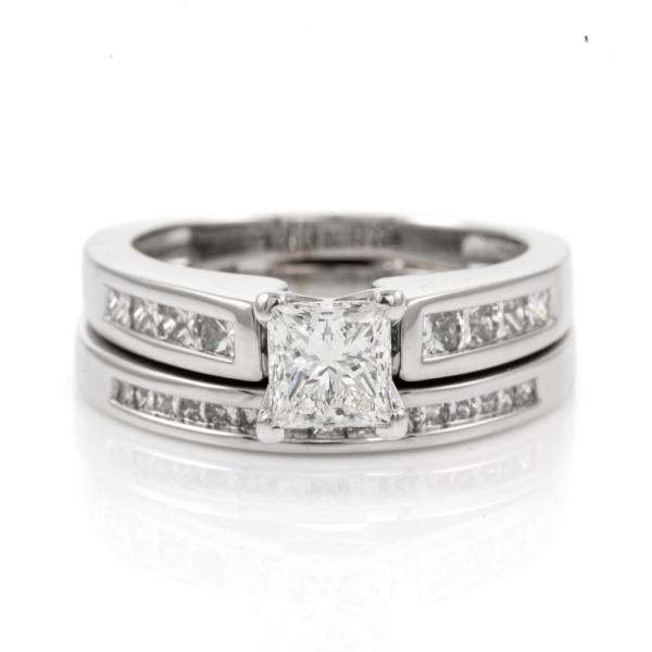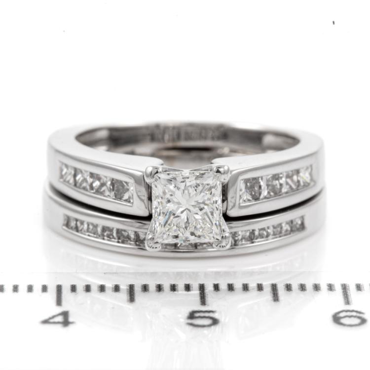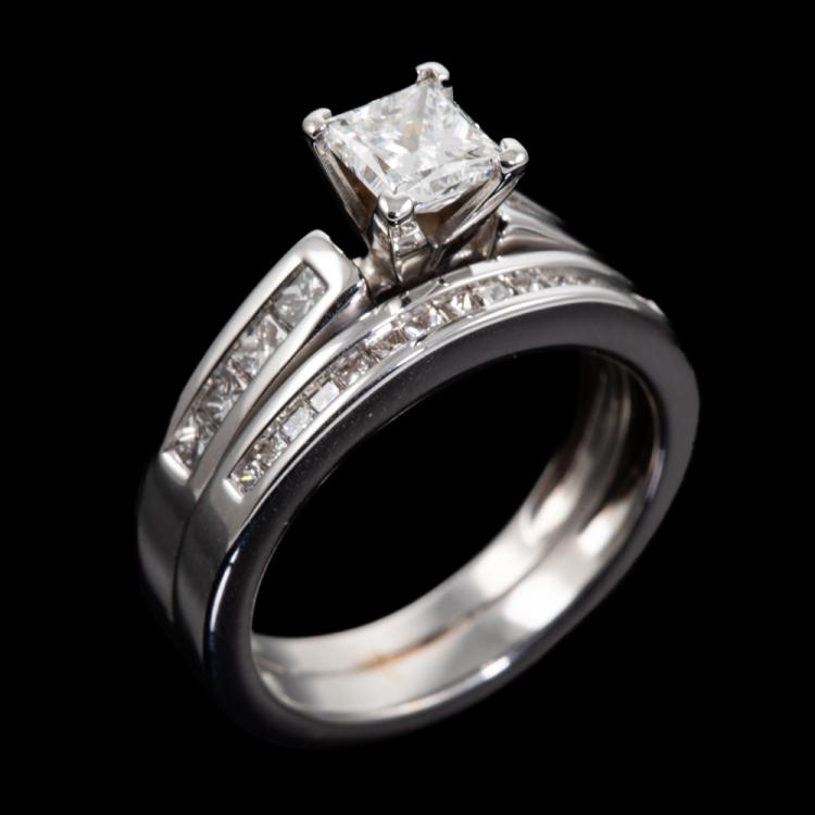 Diamond solitaire & matching eternity ring with a centre princess cut natural Diamond of 0.80ct (with GIA report graded as I SI1#16499536) & shoulder princess cut natural Diamonds totalling 0.55ct (Estimated grading I SI2). Eternity ring with princess cut Natural Diamonds totalling approximately 0.07ct. Platinum & 18ct white gold. Ring size K1/2-ring resizing is not recommended. Weight 9.2g. With original invoice dated 11.06.2007 & Appraisal #210246. (Pre-owned)