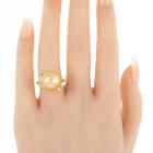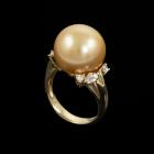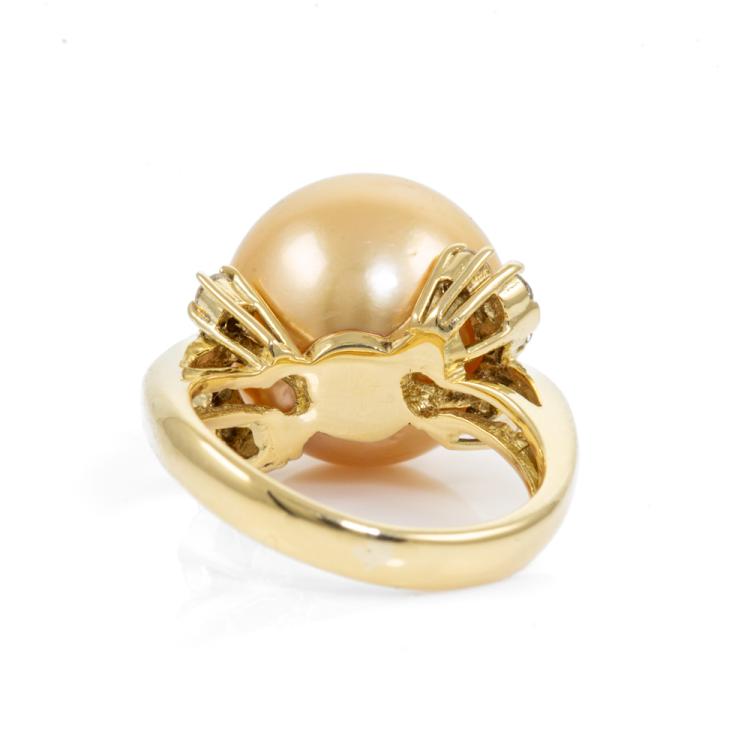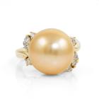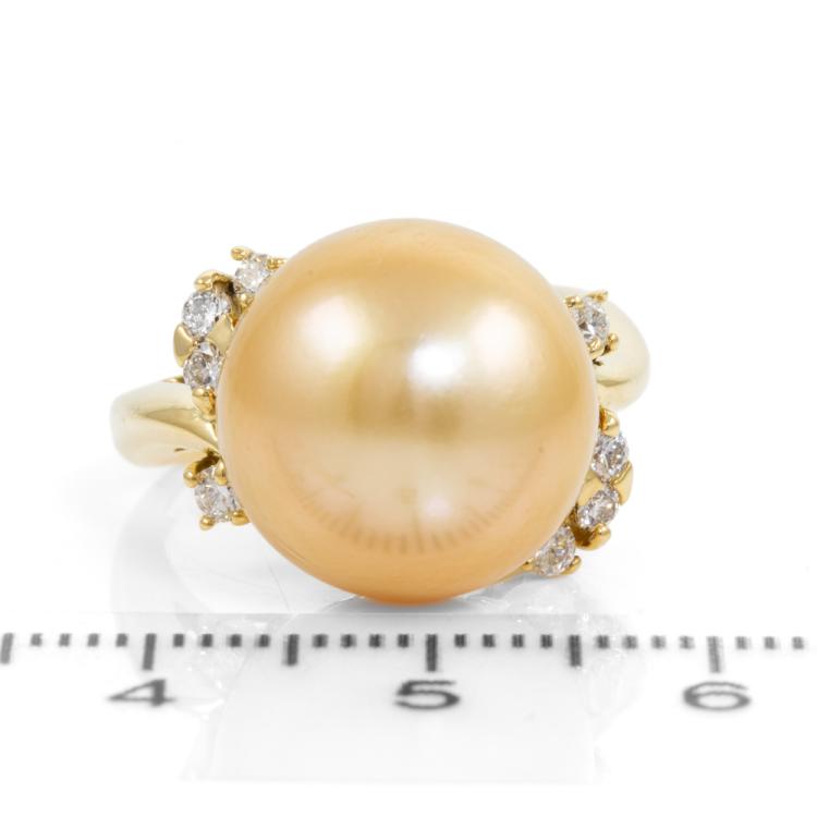 Pearl and Diamond ring with Golden South Sea Pearl of 13.8mm and Natural Diamonds totalling 0.27ct. 18ct yellow gold. Ring size J1/2. Band width: 2.9mm - 2.8mm. Weight: 8.9g. (Pre-owned)