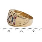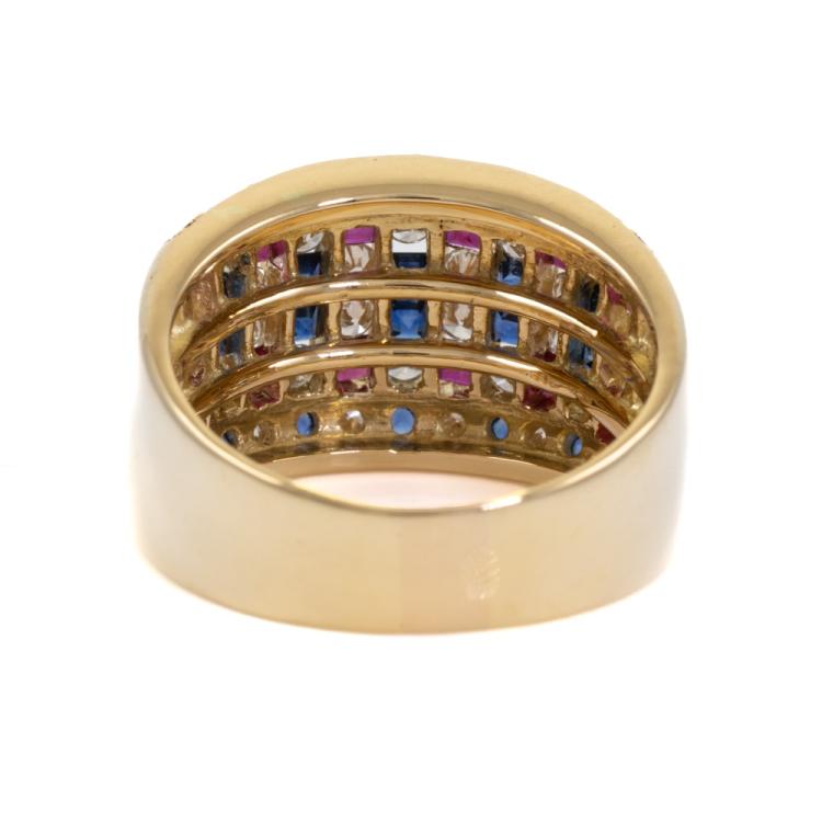 Sapphire, Ruby & Diamond ring with princess cut Natural Sapphires & Rubies totalling 1.39ct and round Natural Diamonds 0.81ct (Estimated grading: I-J SI). 18ct yellow gold. Ring size: N1/2. Band width: 5.10mm - 10.0mm. Weight: 10.1g. (Pre-owned)