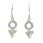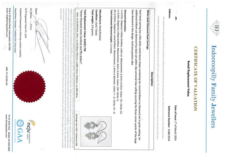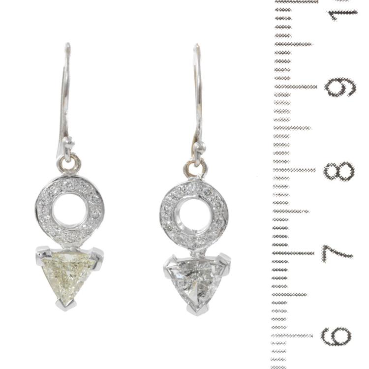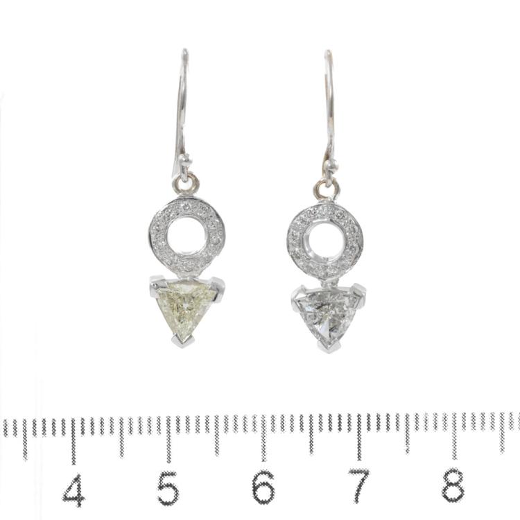 Diamond shepherds hook earrings with 2 trilliant cut Natural Diamonds totalling 1.12ct (Estimated grading: TLC SI1 and OW P1) and round Natural Diamonds totalling 0.28ct. 18ct white gold. Weight: 3.9g. With valuation certificate dated 01/03/24. (Pre-owned)