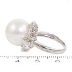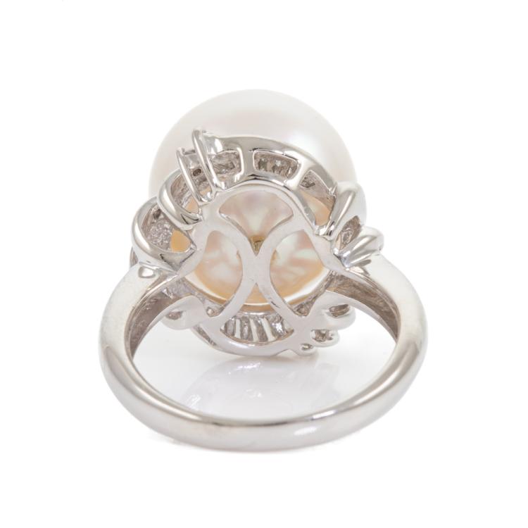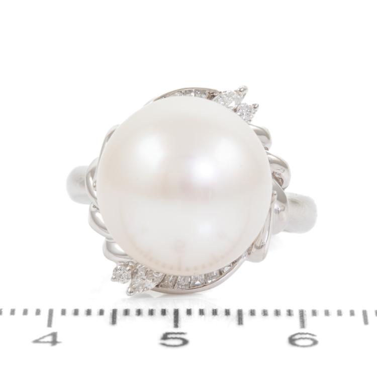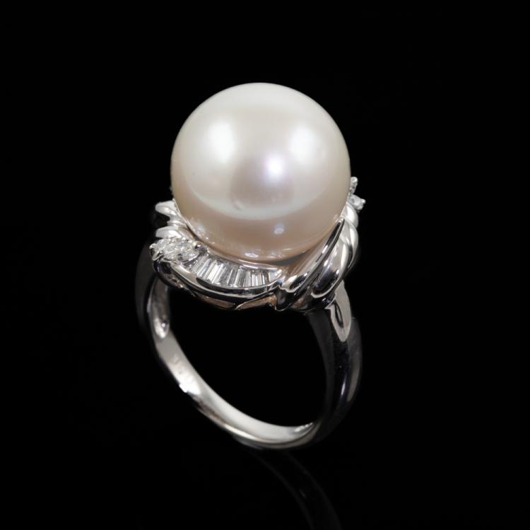 Pearl and Diamond ring with South Sea Pearl of 14.1mm with round, marquise & baguette cut Natural Diamonds totalling 0.31ct (Estimated grading: G SI). Platinum 900. Ring size M. Band width: 2.5mm - 2.9mm. Weight: 12.0g. (Pre-owned)