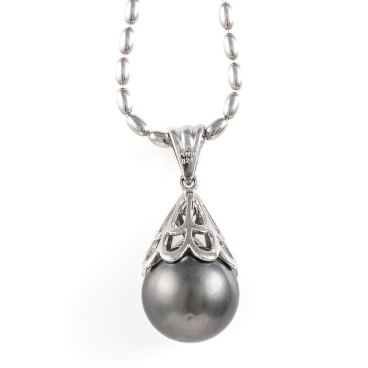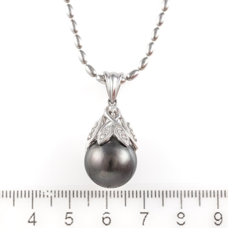 Pearl and Diamond pendant with a Tahitian Pearl of 14.2mm and round Natural Diamonds totalling 0.24ct. Platinum 900 with platinum 850 chain. Length: 44.5cm. Weight: 21.1g. (Pre-owned)