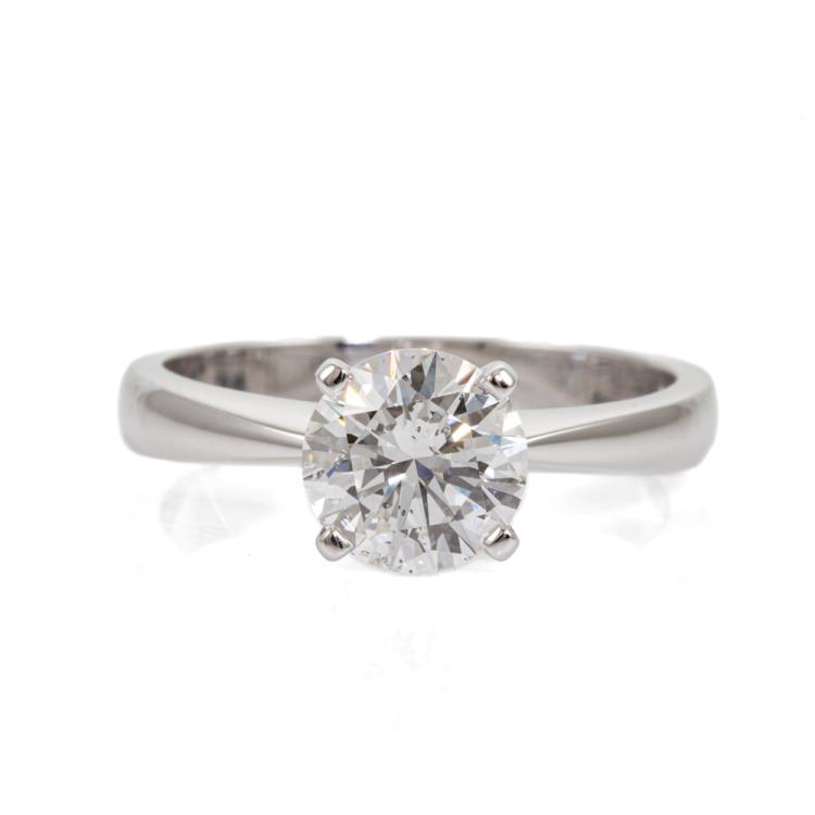 Diamond solitaire ring with round brilliant cut natural Diamond of 1.51ct (with GIA Report graded as D SI2 #6472240727). 18ct white gold. Ring size M1/2. Band width: 3.2mm - 2.1mm. Weight 4.6g. (New)