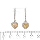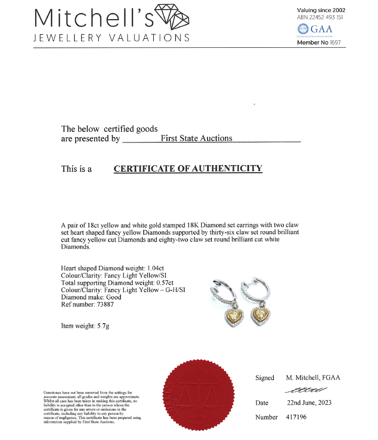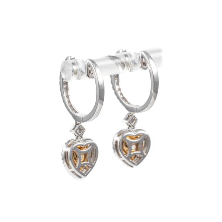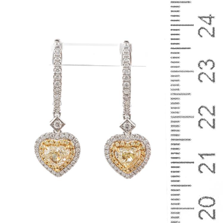 Yellow and white Diamond huggie drop earrings with heart shaped fancy Yellow Natural Diamonds totalling 1.04ct (Estimated grading: Fancy Light Yellow SI) and remaining round Natural Diamonds totalling 0.57ct (Estimated grading: Fancy Light Yellow & G-H SI). 18ct yellow and white gold. Weight: 5.7g. With certificate #417196. (As new)