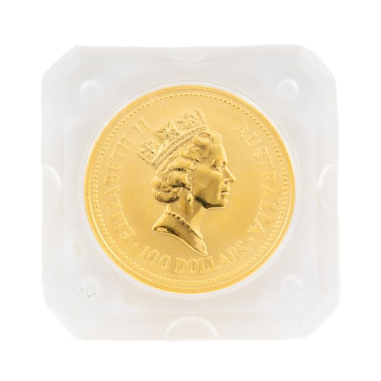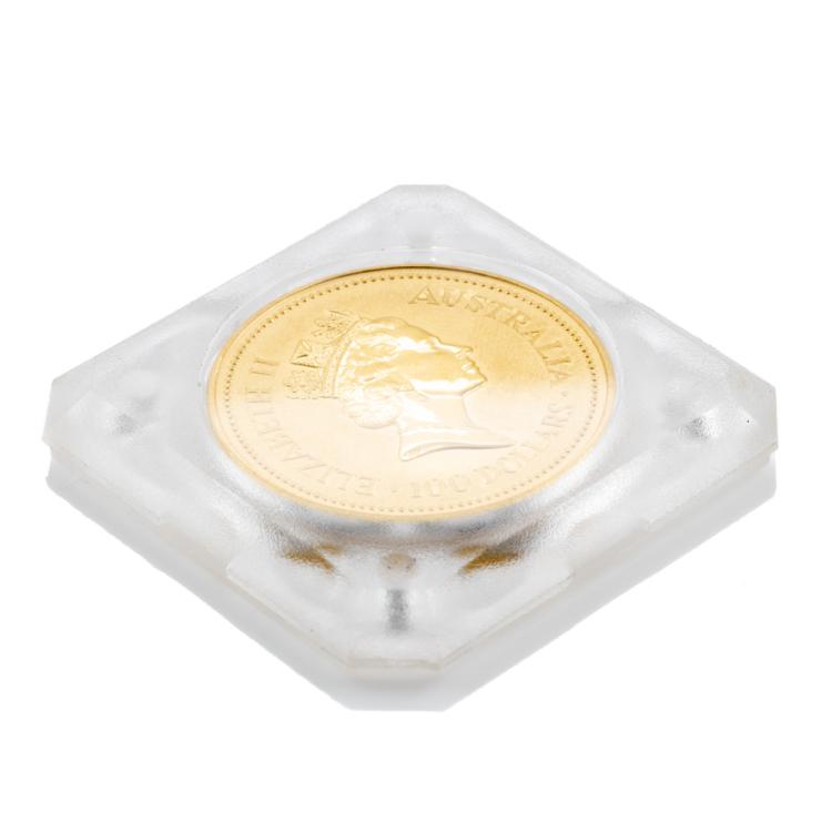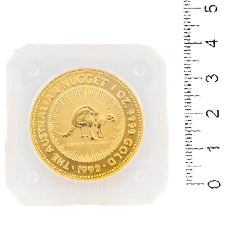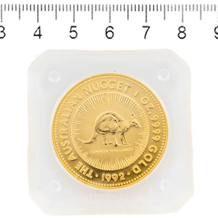 Perth Mint Australian Kangaroo 9999 Gold Coin. 1 OZ. Circa: 1992. With Legal Tender 100AUD face value. Size: 32.1mm. Weight 31.1g.