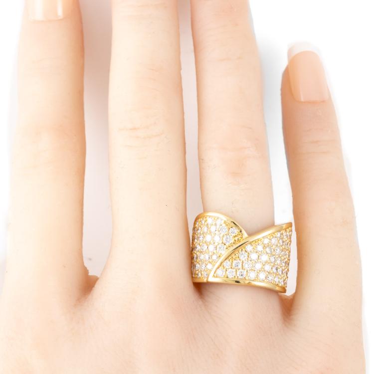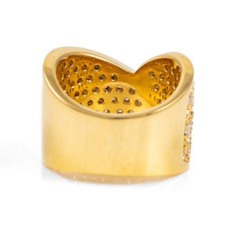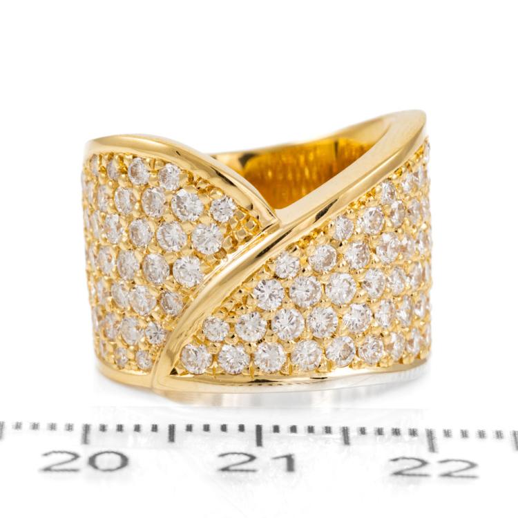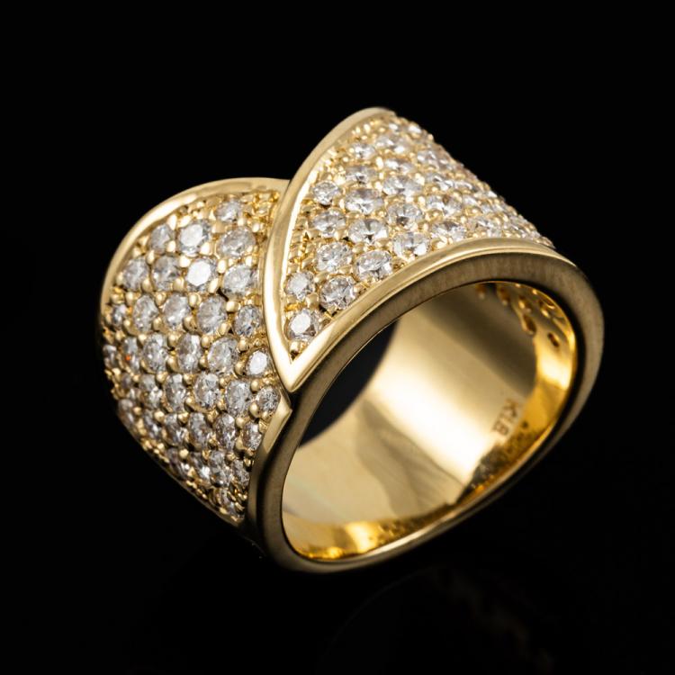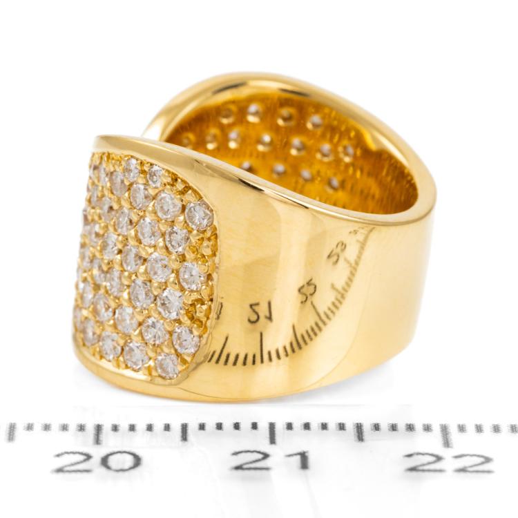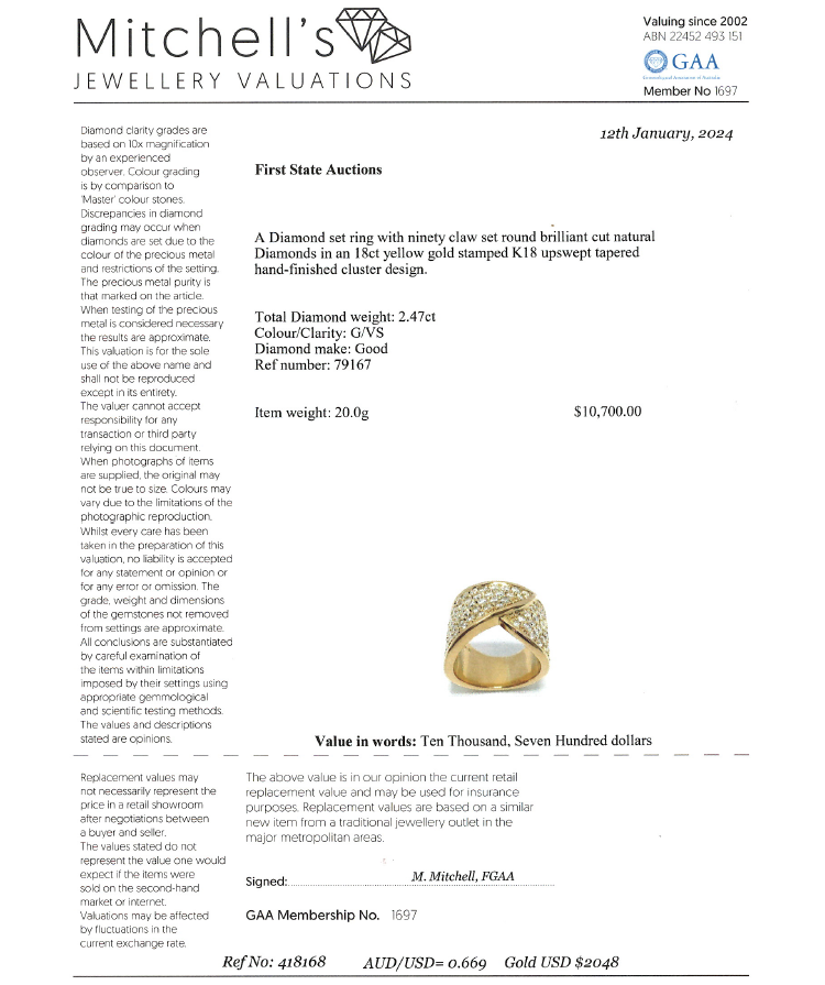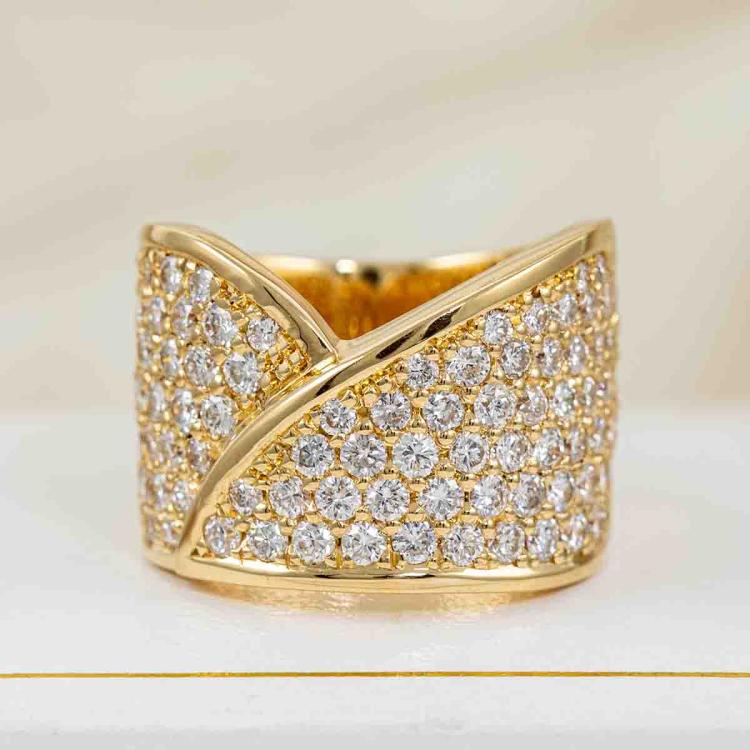 Diamond Dress ring with round Natural Diamonds totalling 2.47ct (Estimated grading: G VS). 18ct yellow gold. Ring size J - ring resize is not recommended. Band width: 8.9mm - 12.9mm. Weight: 20.0g. With Valuation Certificate #418168. (Pre-owned).