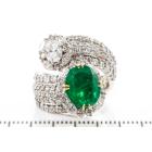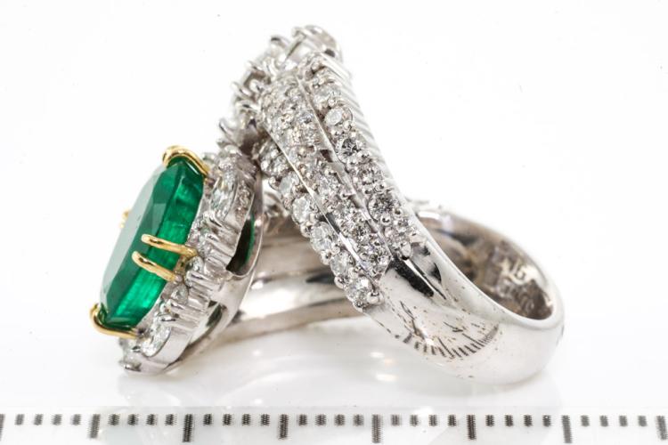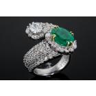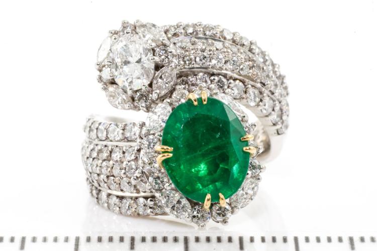 Emerald and Diamond ring with oval shape Natural Emerald of 2.65ct and oval shape, marquise cut & round Natural Diamonds totalling 2.04cts (Estimated grading: H-I SI). 18ct yellow gold and platinum. Ring size H1/2 - ring resizing is not recommended. Weight: 13.1g. With certificate #416889. (Pre-owned)