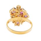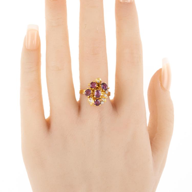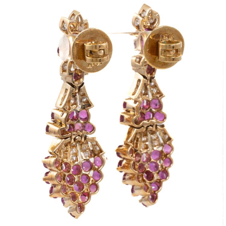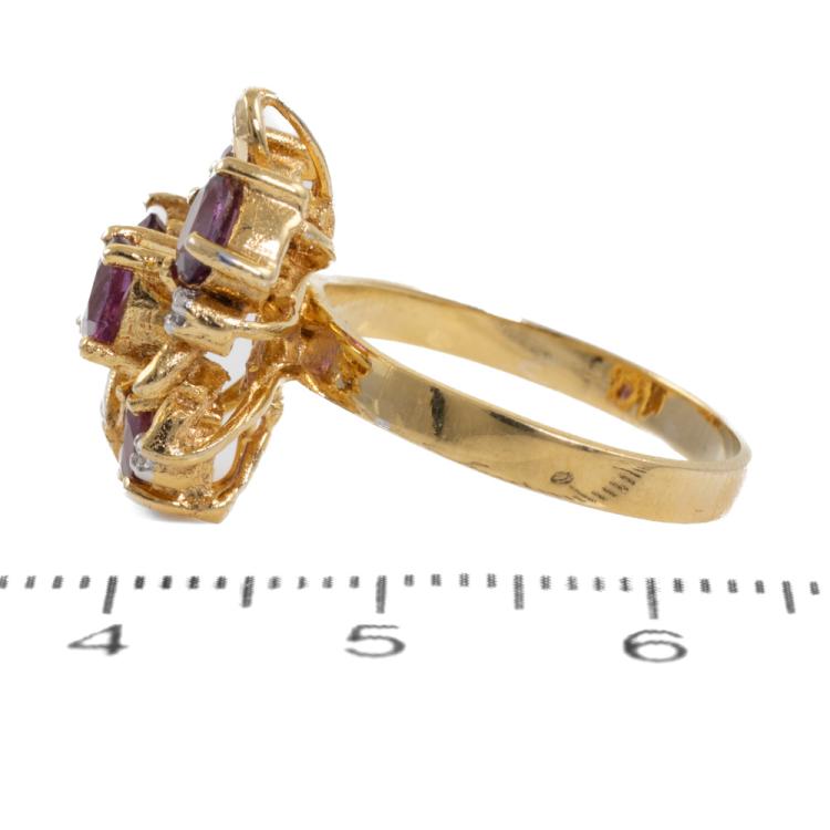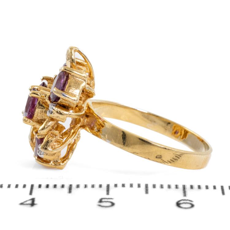 Ruby and Diamond screw back earrings (for pierced ears) and ring set with round & oval shape Natural Rubies totalling approximately 3.00ct and round Natural Diamonds totalling approximately 0.55ct (Estimated grading: H SI-P1). 18ct yellow gold earrings and 14ct yellow gold ring. Ring size M1/2. Band width: 2.3mm-2.6m. Total weight: 17.9g. (Pre-owned)