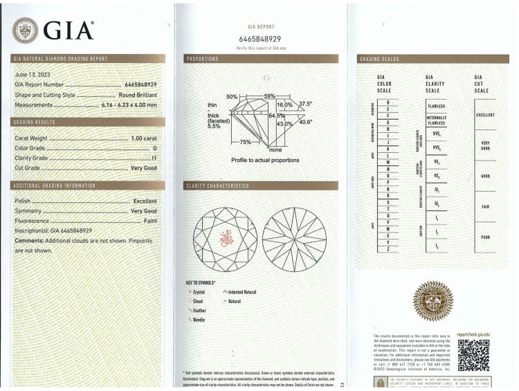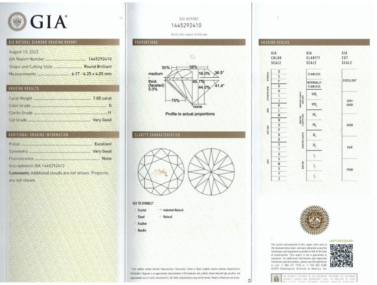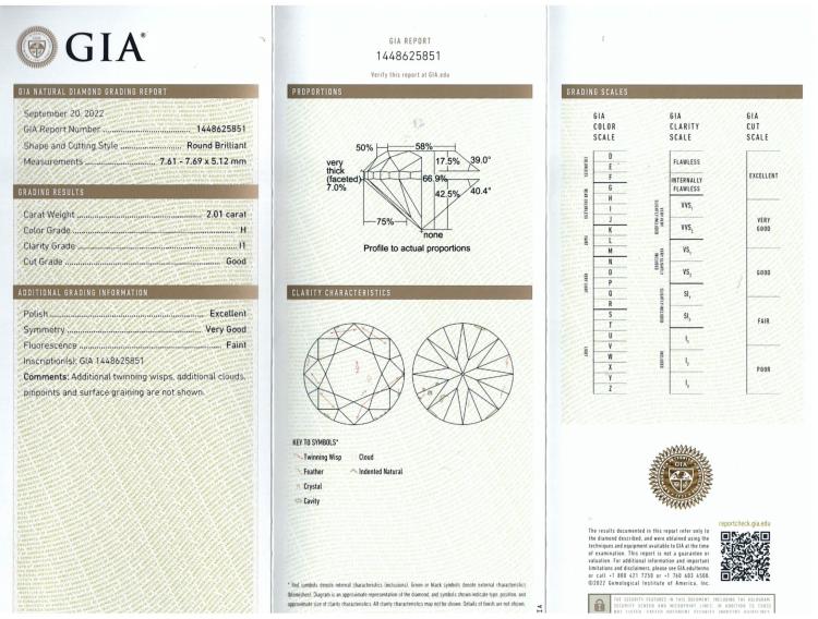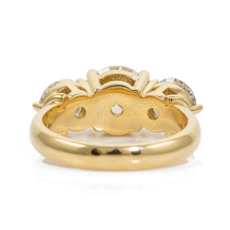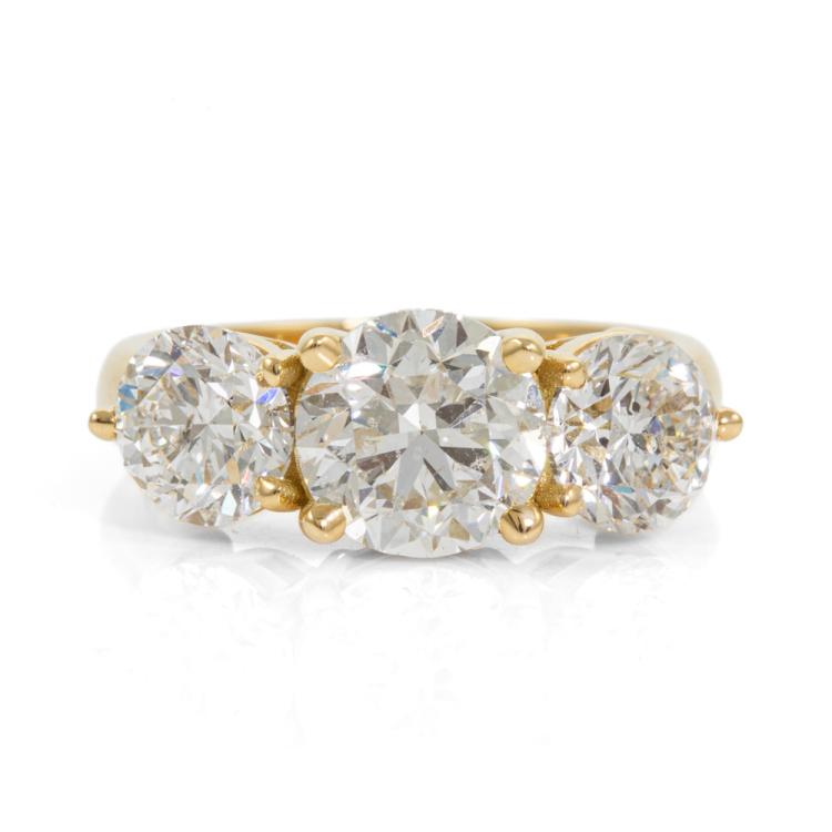 Diamond trilogy ring with centre round Natural Diamond of 2.01ct (with GIA Report graded as H P1 #1448625851) and 2 side round Natural Diamonds totalling 2.00cts (with GIA Reports graded as G P1 #6465848929, 1445292410). 18ct yellow gold. Ring size: L. Band width: 3.5mm - 3mm. Weight: 6.9. With Valuation Certificate #418430. (New)