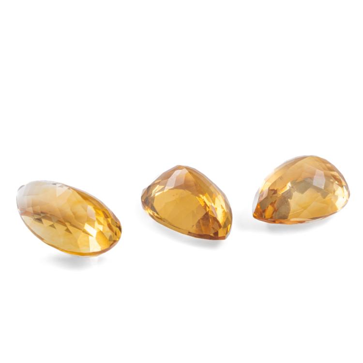 3 Loose pear shape Natural Citrine totalling 45.86ct. 3 stones weighing: 12.64ct (Approx. size: 20.1mm x 14.0mm x 8.7mm), 15.44ct (Approx. size: 18.8mm x 14.3mm x 9.5mm), 17.75ct (Approx. Size: 22.9mm x 13.1mm x 10.7mm) (As New)^