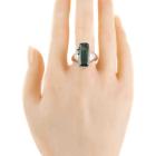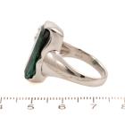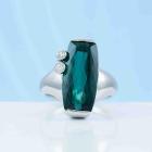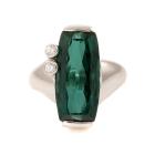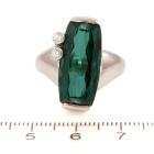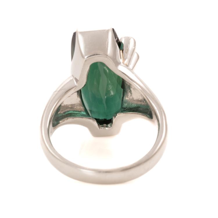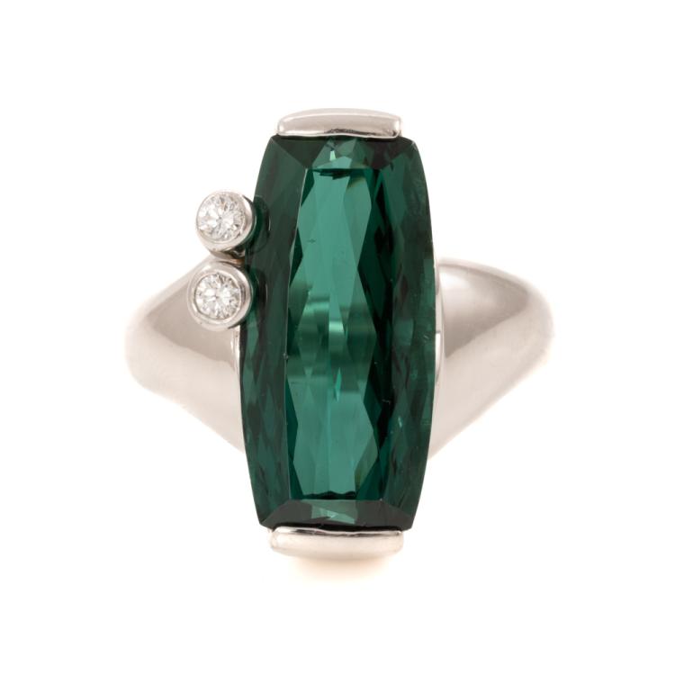 Tourmaline and Diamond ring with fancy rectangular cut natural green Tourmaline of 6.06ct and round natural Diamonds of 0.12ct. Platinum 900. Ring size P. Band width: 3.1mm - 5.1mm. Weight: 17.5g. With Certificate #418843. (Pre-owned)