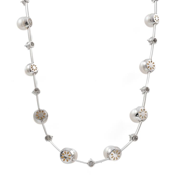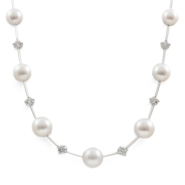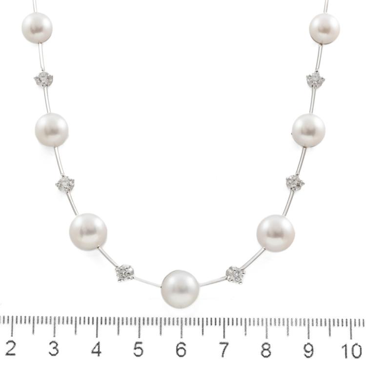 Stephen Hafner Pearl necklace with 13 Akoya Pearls of 6.2mm-9.1mm and 17 round natural Diamonds totalling 1.91ct (Estimated grading H-J VS-SI). 18ct white gold clasp. Length: 38.5cm. Weight: 27.3g. Valuation Certificate: #418982. (Pre-owned)