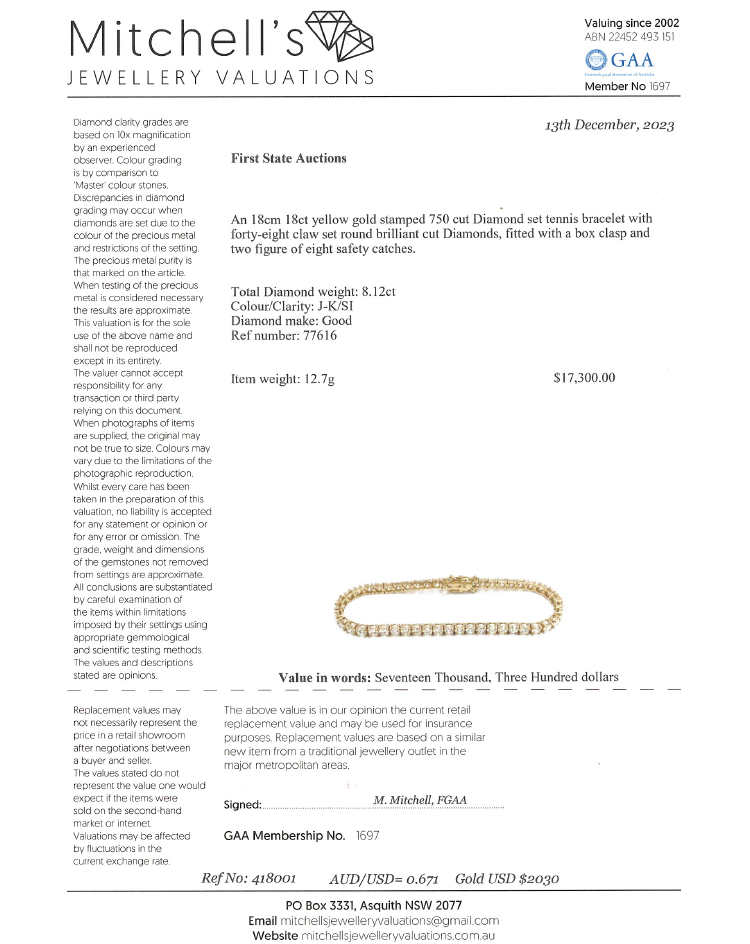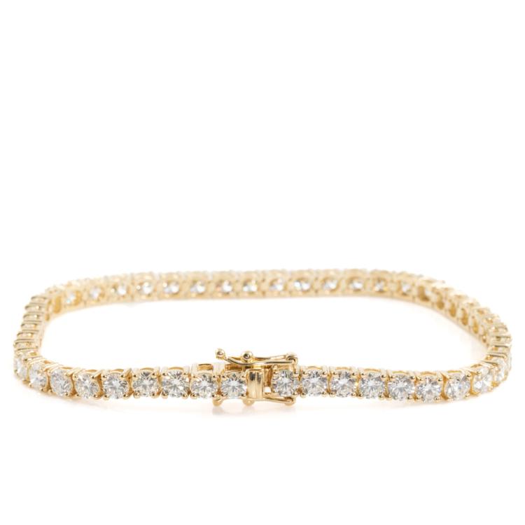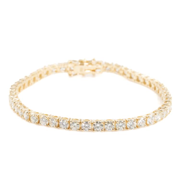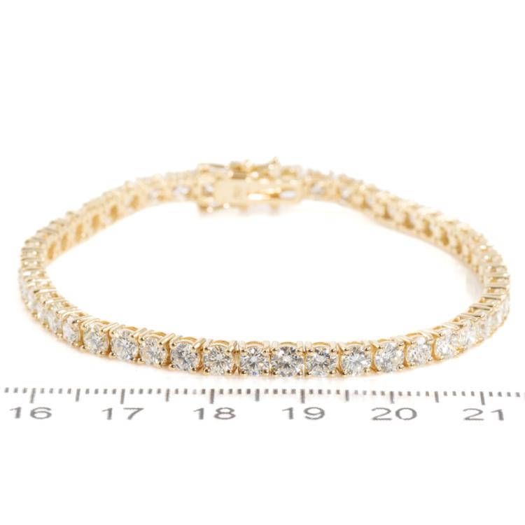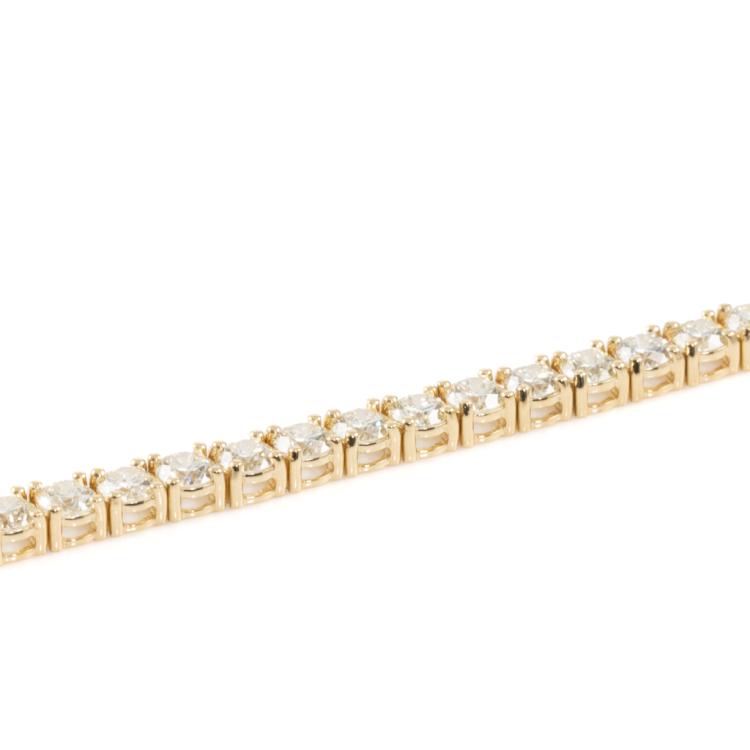 Diamond tennis bracelet with 48 round brilliant cut Natural Diamonds totalling 8.12cts (Estimated grading: J-K SI). 18ct yellow gold. Length: 18cm. Weight: 12.7g. With Valuation Certificate #418001. (New)