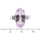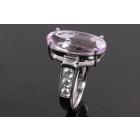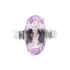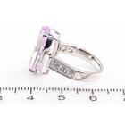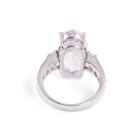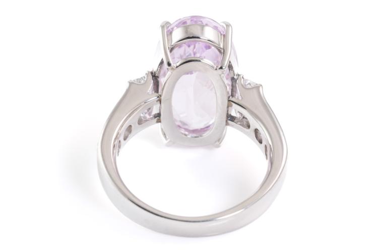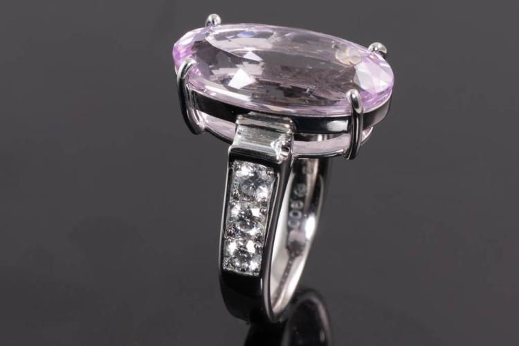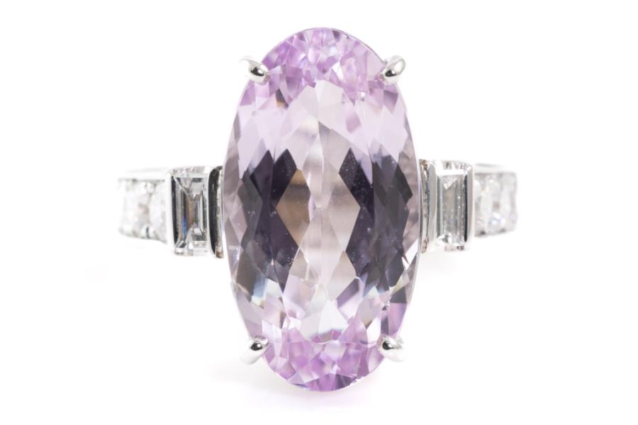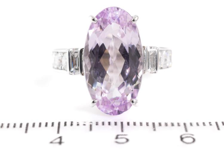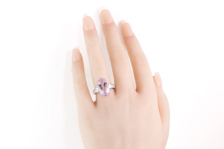 Kunzite and Diamond ring with an oval shape Natural Kunzite of 8.23ct and round & baguette cut Natural Diamonds totalling 0.72ct (Estimated grading: G SI). Platinum -900. Ring size L. Weight: 10.1g. (Pre-owned)