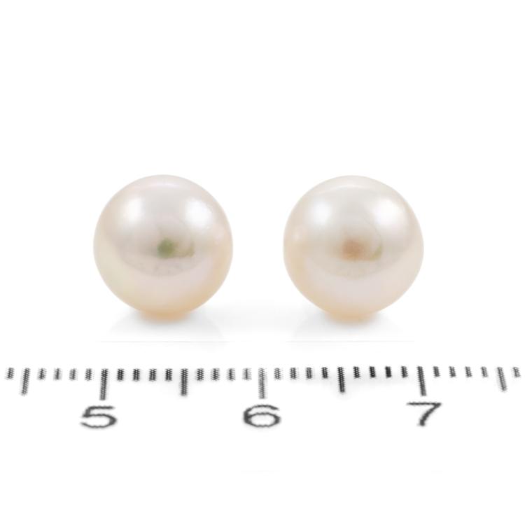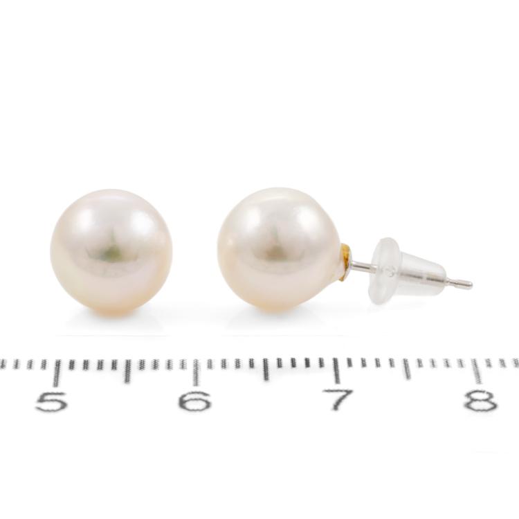 Pearl stud earrings with 2 off-round South Sea Pearls of 9.2mm - 9.3mm. 14ct white gold with silicon backs. Weight: 2.6g. (Pre-owned)
