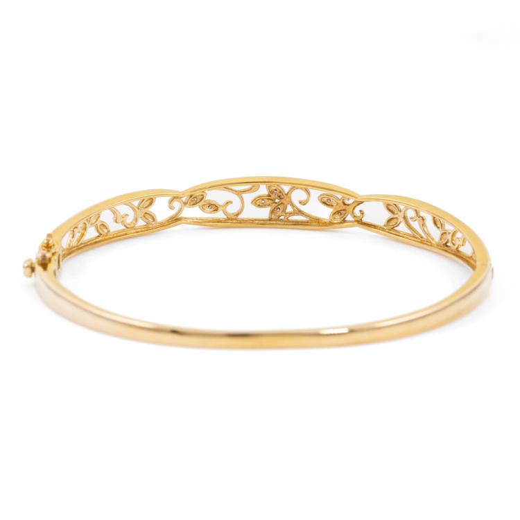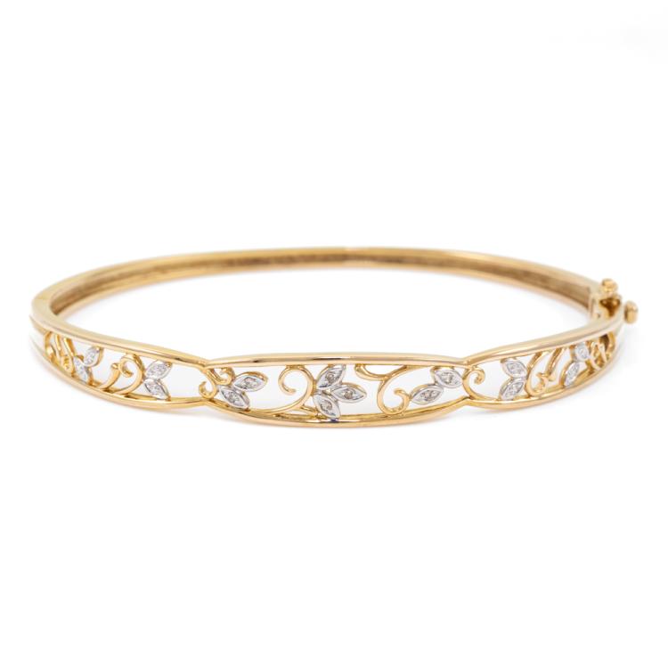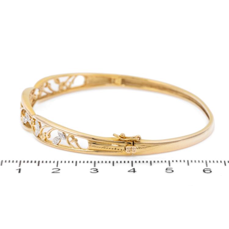 Diamond oval shape bangle with round natural Diamonds totalling approximately 0.10ct. 9ct yellow and white gold. Circumference: 17cm. Minimum width: 2.5mm. Weight 8.6g. (pre-owned)