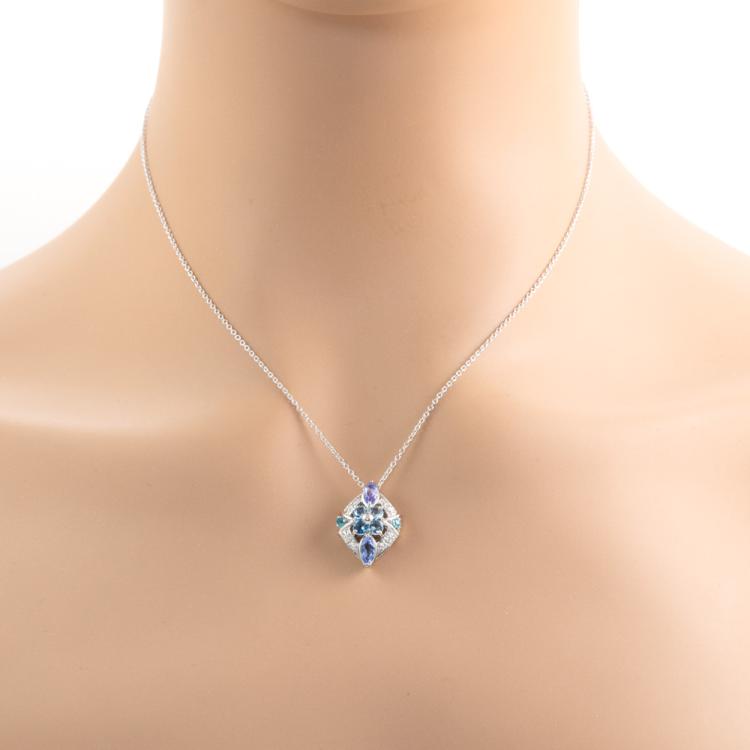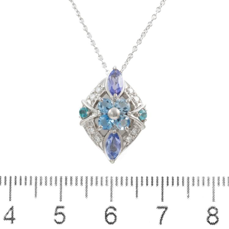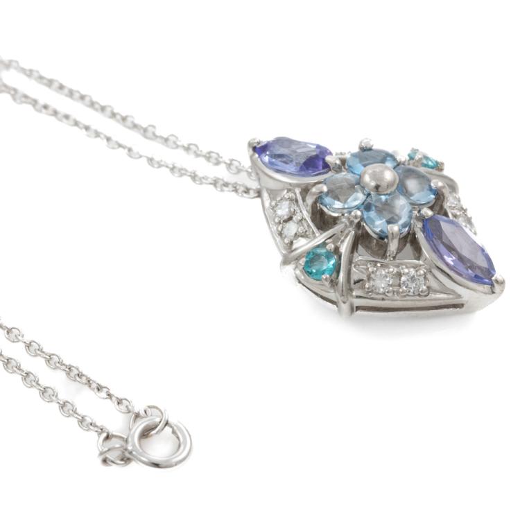 Aquamarine, Tanzanite and Diamond pendant with round blue Natural Aquamarines totalling 0.35ct, two Natural marquise cut tanzanites totalling 0.40ct, two round natural Pariaba tourmalines totalling 0.05ct. Platinum 900 with 40cm 14ct white gold chain. Weight: 6.2g (Pre-owned)