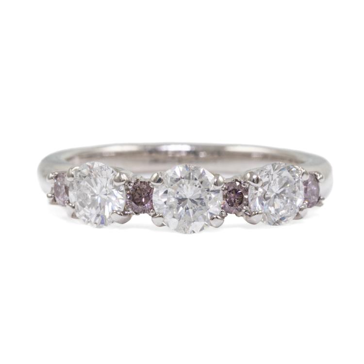 Diamond ring with 3 round Argyle Origin natural pink Diamonds totalling approximately 0.03ct (one Diamond of 0.01ct with GSL Report graded as Natural Fancy Light Pink SI2 #AA69179/1, Origin: Argyle Deposit, Western Australia) and round natural white Diamonds totalling approximately 0.32ct (Estimated grading: G-H P1). 18ct white gold. Ring size K1/2. Band width: 2.2mm - 3.4mm. Weight: 3.8g. (Pre-owned)