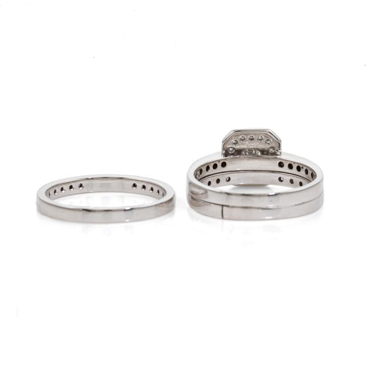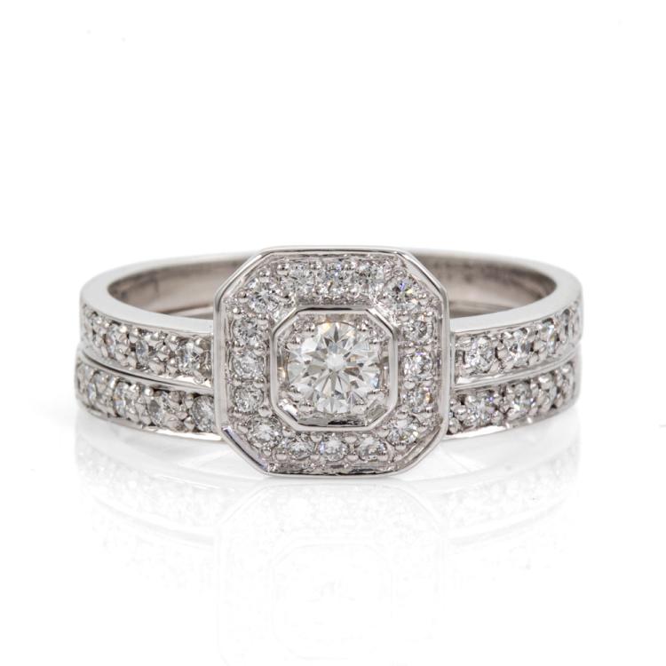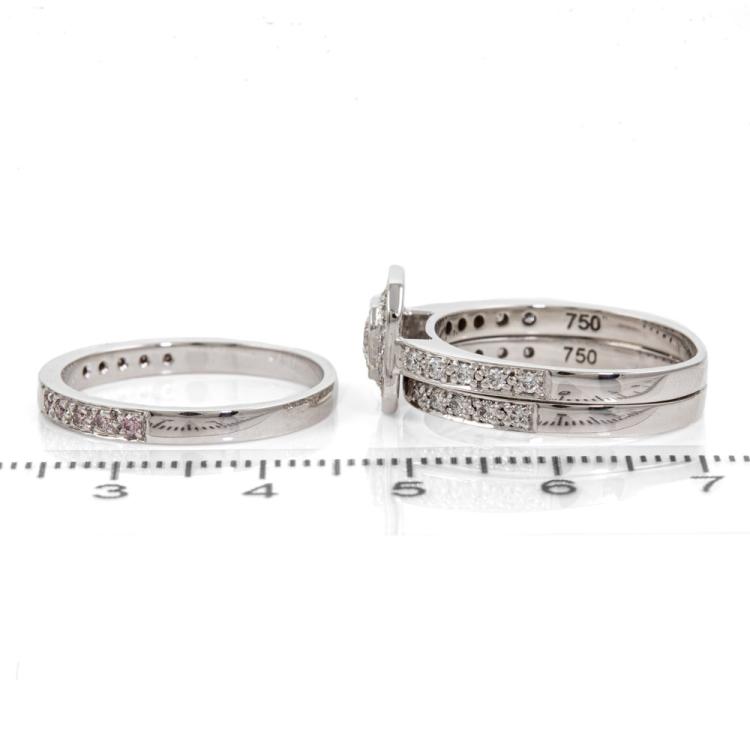 Diamond ring set with a centre round brilliant cut Natural Diamond of 0.23ct (Estimated grading: F-G VS1) and remaining round Natural Diamonds totalling 0.60cts. Matching band with 10 round Natural Diamonds totalling 0.15cts (Graded as 6 Pink Rose SI Argyle ref# RPR3A(6)(A)). 18ct white gold (note resize mark on main ring). Ring size Q. Band width: 4.5mm-5mm & 2.3mm-2.6mm. Total weight: 11.2g. With copies of Haigh's Jewellers dated 12/08/21. (Pre-owned)